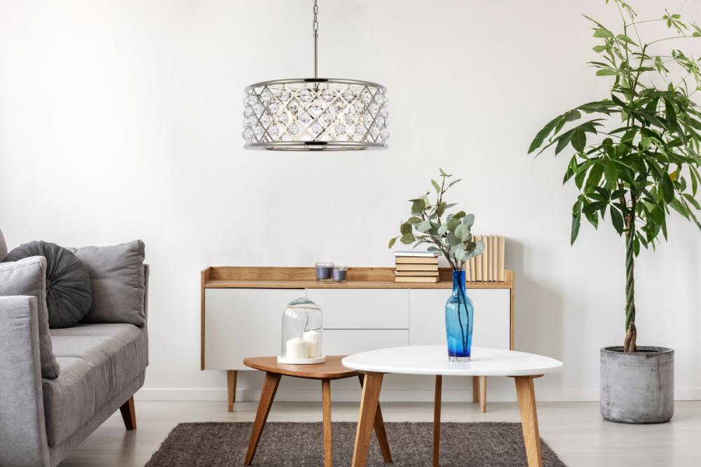 Lamp features a diameter of 25 inches, a height of 10.5 inches, a minimum hanging length of 16 inches, a maximum hanging length of 70 inches, and requires 6 candelabra bulbs