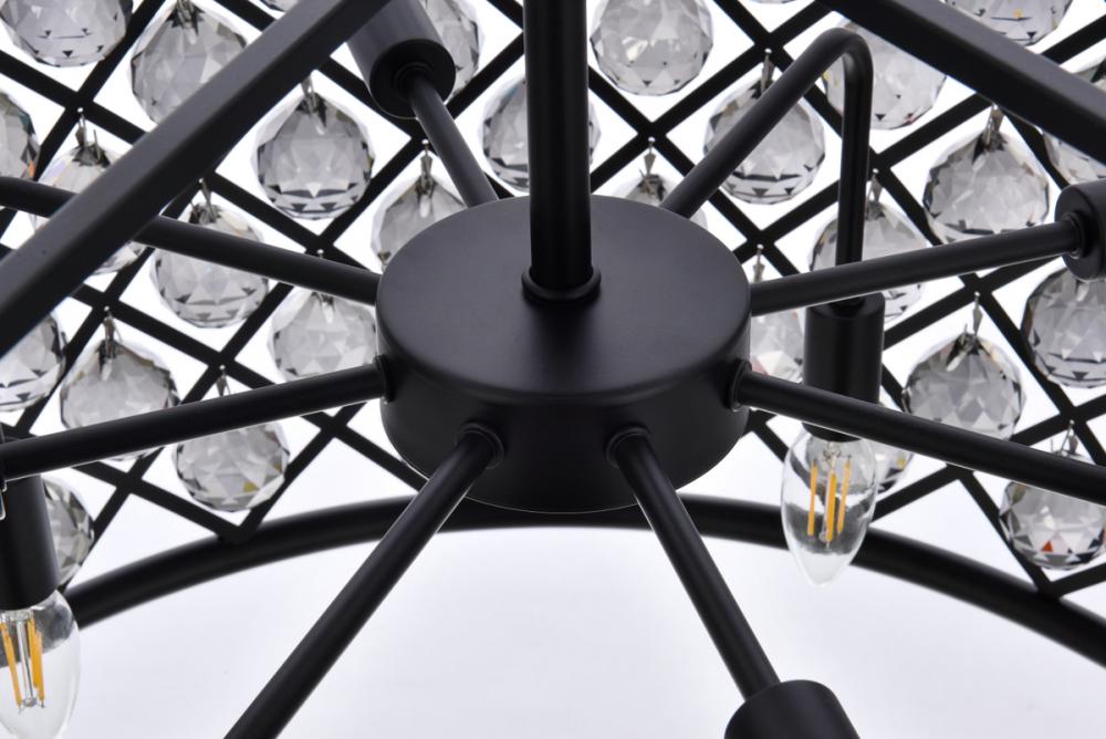 Lamp features a diameter of 27.5 inches, a height of 21 inches, a minimum hanging length of 27 inches, a maximum hanging length of 81 inches, and requires 8 candelabra bulbs