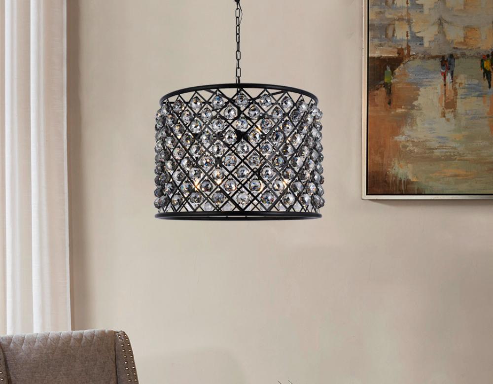 Modern simplicity meets organic beauty in the breathtakingly unique Madison collection. Hand-polished, multifaceted clear, golden-teak, or Silver-shade crystal spheres shimmer like dewdrops in a circular forged-iron grid with a golden-iron, Matte Black, or polished-nickel finish. These airy pendant lamps will brighten up a kitchen, dining room, foyer, or stairwell in an explosion of reflected light.