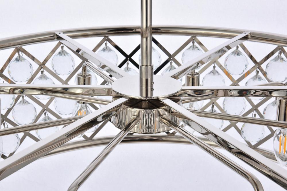 Lamp features a diameter of 32 inches, a height of 10.5 inches, a minimum hanging length of 16 inches, a maximum hanging length of 70 inches, and requires 8 candelabra bulbs
