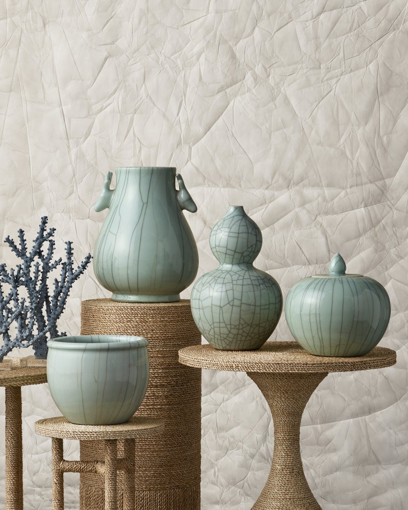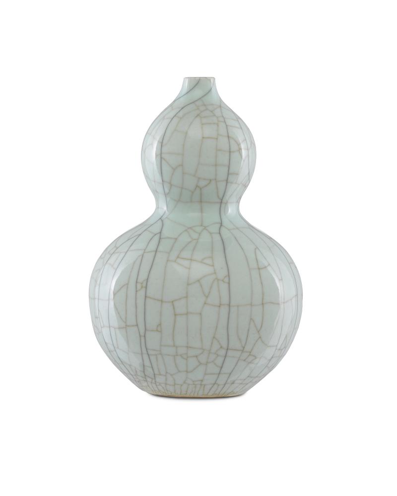 The hand-thrown porcelain body of the Maiping Double Gourd Vase covered with a celadon crackle glaze has been baked and given a light thermic shock to create the crackled lines in the texture. Some lines on the pale green vase are darkened with real tea leaves while others are covered with black calligraphy ink to create depth in the porcelain.