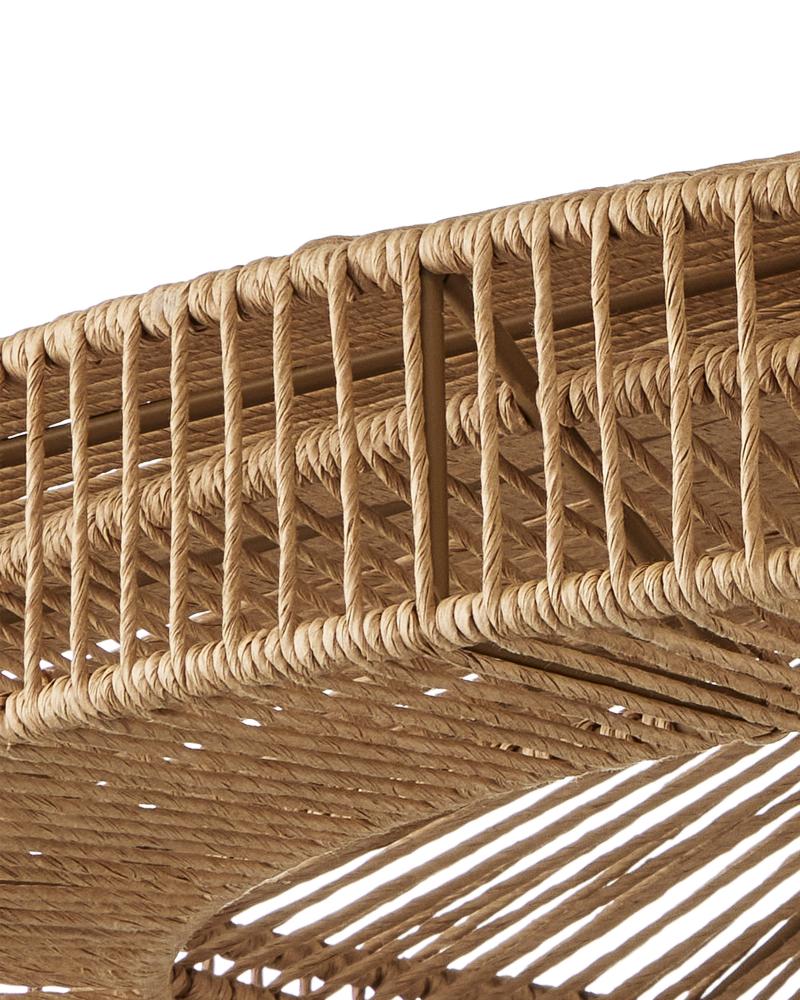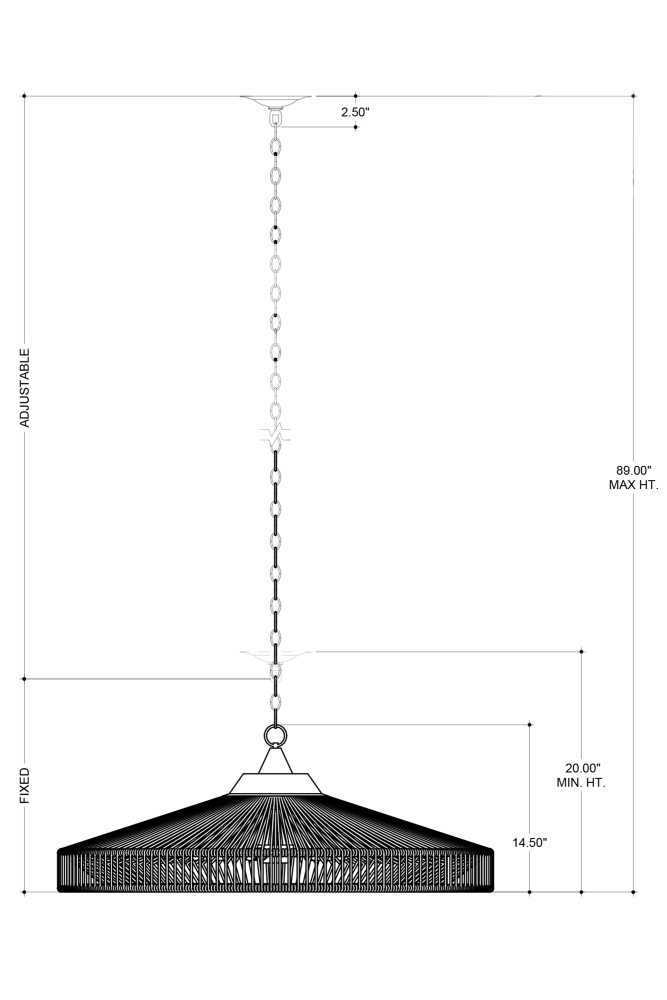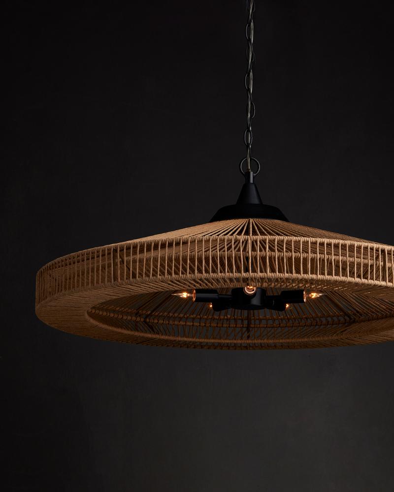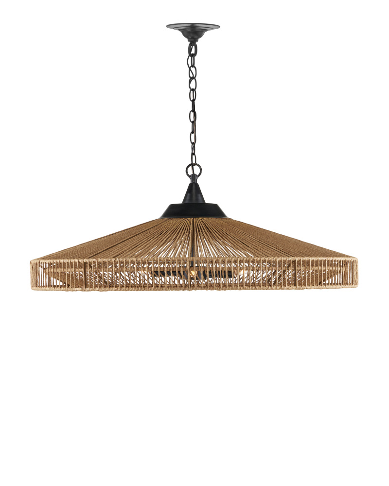 The Maldives Chandelier is made of wrought iron in a mix of satin black and khaki finishes to make this fixture a shoe-in for a black and natural style approach. The rope-like cage that surrounds it, made of Kraft paper twine, is woven to the frame in two layers, the one closest to the light source more concentrated to diffuse the light. The rope chandelier is fitted with five bulbs to make it a luminous fixture. Adjustable from 19" to 87" with use of included chain/rod kit/cable. If your space calls for a longer drop, additional chain/rods/cable is available for purchase.