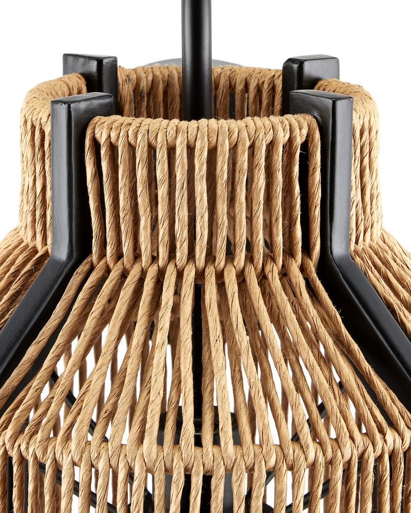 The Mali Wall Sconce has a complex interplay of sleek and earthy elements. The lines that rise above and below the natural woven shade are made of wrought iron in a satin black finish, as are the stem curving into the sconce and the hardware that holds the bulb. These are the clean-lined elements that contrast the Kraft paper twine on the rope sconce, which is tightly woven but not so dense that it interrupts the warm glow of illumination from its interior.