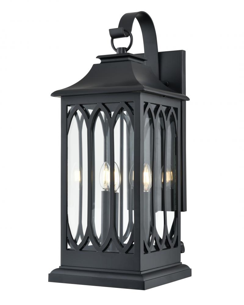 Exquisite metalwork creates wonderful light play for the Mallorey Family of outdoor lighting. The aluminum housing, finished in powder coated black, is punctuated with a modern spin on Gothic-style arches and the traditional hook-and-arm profile. The fixtures are available as 1-, 2-, and 3-light sconce, 3-light pendant, or 3-light post, and create a dramatic effect across any exterior.