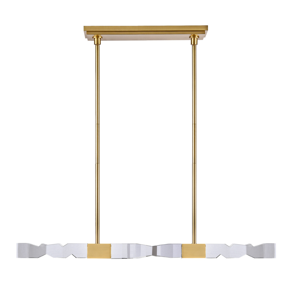 LED 49" 4-light hand formed and polished heavy gauge 2" x 2" linear crystal pendant, with deep edges and slants with each side unique. Refined iron metal details with our premium aged brass finish. Adjustable arms for unique designs and integrated Replaceable LED with 3CCT 3000K, 3500K and 4000K.