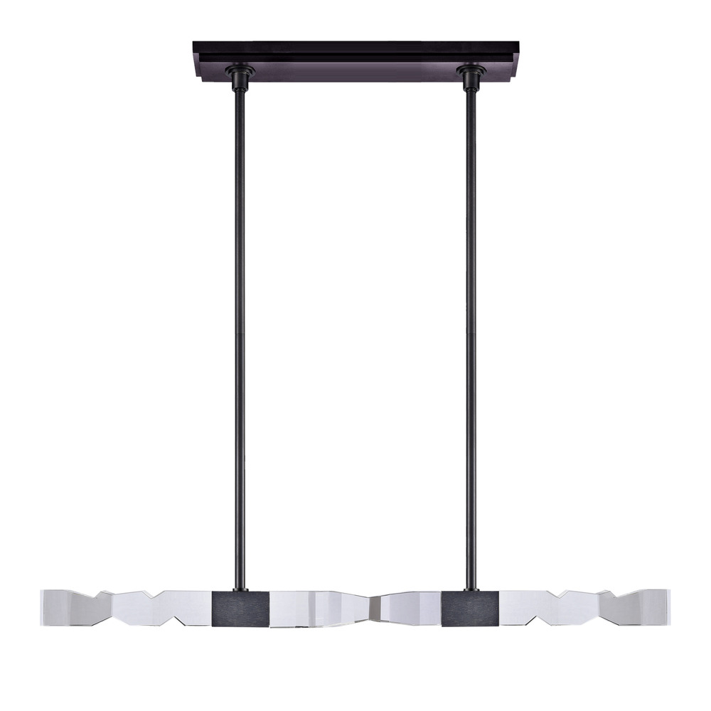 LED 49" 4-light hand formed and polished heavy gauge 2" x 2" linear crystal pendant, with deep edges and slants with each side unique. Refined iron metal details with our sleek satin brushed black finish. Adjustable arms for unique designs and integrated Replaceable LED with 3CCT 3000K, 3500K and 4000K.