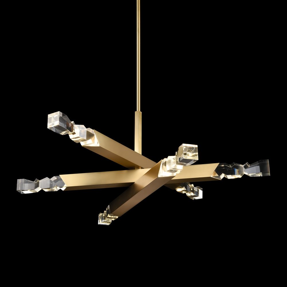LED 60" 6-light hand formed and polished heavy gauge 3" x 3" crystal chandelier, with deep edges and slants with each side unique. Refined iron metal details with our sleek satin brushed black finish. Adjustable arms for unique designs and integrated Replaceable LED with 3CCT 3000K, 3500K and 4000K.