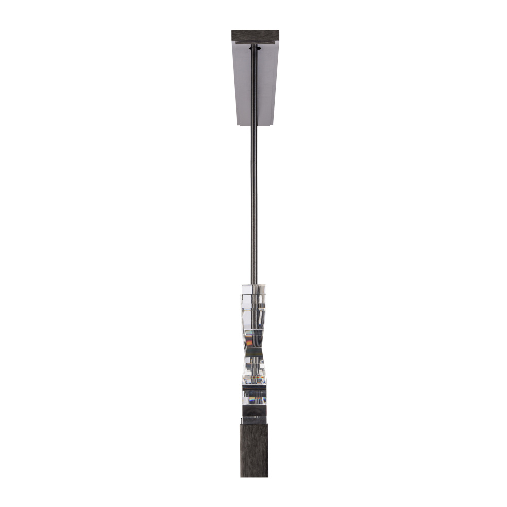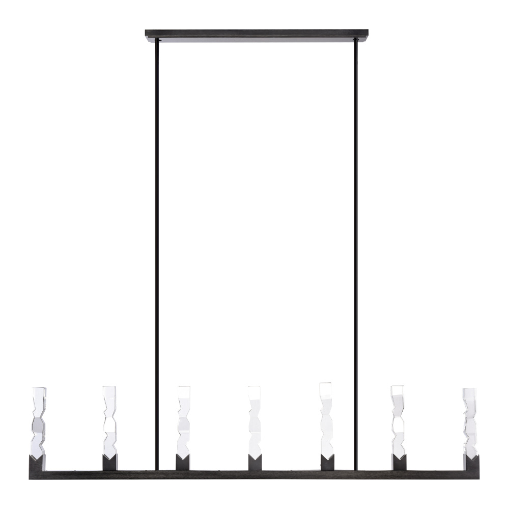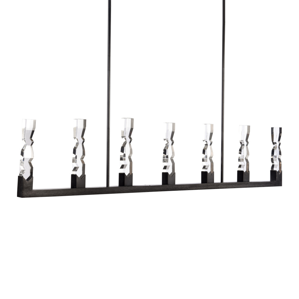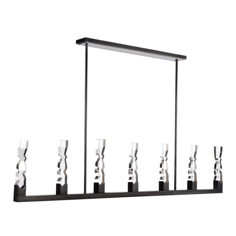 Grand 72" LED 7-light linear pendant including hand formed and polished heavy gauge 2" x 2" crystals with deep edges and slants with each side unique. Refined iron metal details with our sleek satin brushed black finish. Integrated Replaceable LED with 3CCT 3000K, 3500K and 4000K.