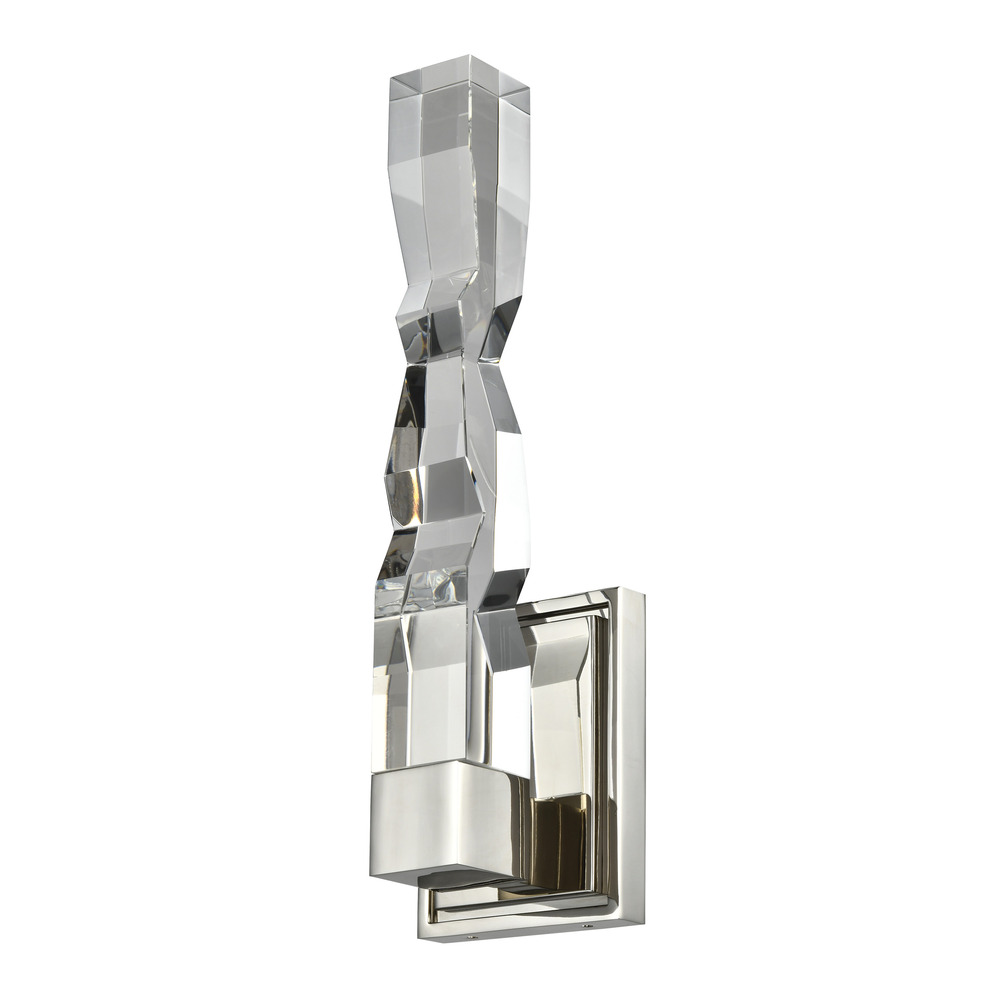 LED hand formed and polished heavy gauge 2" x 2" crystal vertical wall sconce, with deep edges and slants with each side unique. Refined iron metal details with our luxurious polished nickel finish. Integrated Replaceable LED with 3CCT 3000K, 3500K and 4000K.
