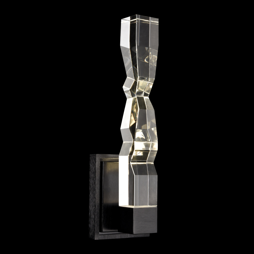LED hand formed and polished heavy gauge 2" x 2" crystal vertical wall sconce, with deep edges and slants with each side unique. Refined iron metal details with our sleek satin brushed black finish. Integrated Replaceable LED with 3CCT 3000K, 3500K and 4000K.