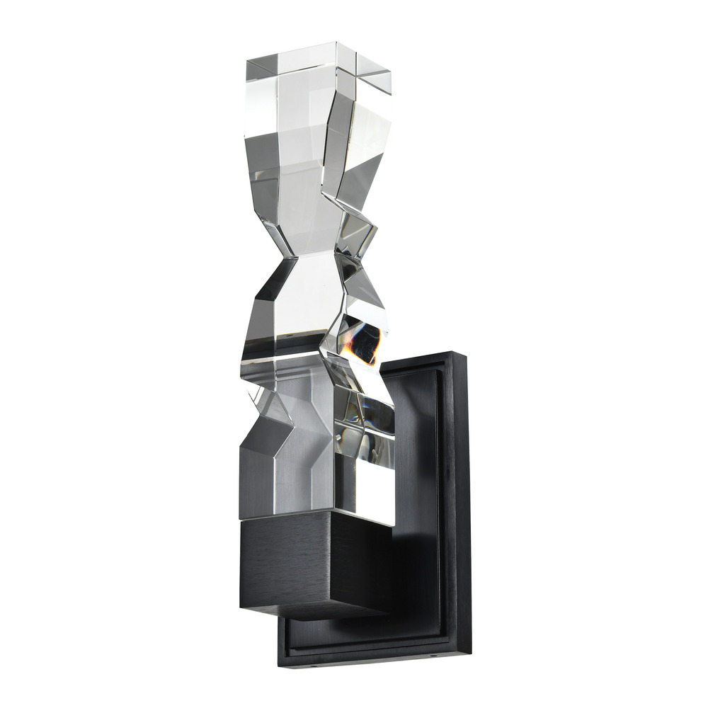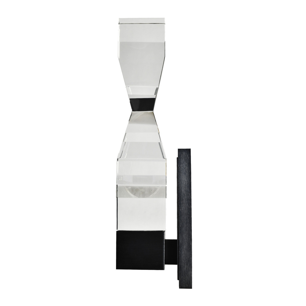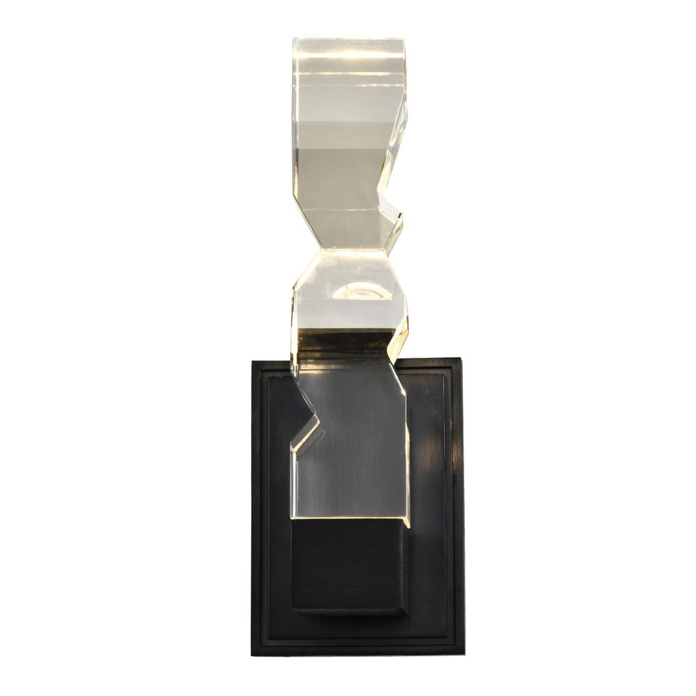 LED hand formed and polished heavy gauge 3" x 3" crystal vertical wall sconce, with deep edges and slants with each side unique. Refined iron metal details with our premium aged brass finish. Integrated Replaceable LED with 3CCT 3000K, 3500K and 4000K.