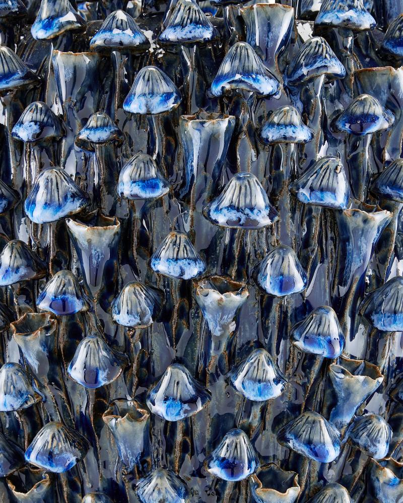The Manitapi Large Blue Vase is made by a group of women who live at the border of Burma and Thailand. Made from black terracotta, this incredible hand-thrown dark blue vase is completely covered in handmade bell-shaped flowers, a painstaking process that takes many hours with each vase. Once the blossoms are in place, the vase is glazed with a deep blue.