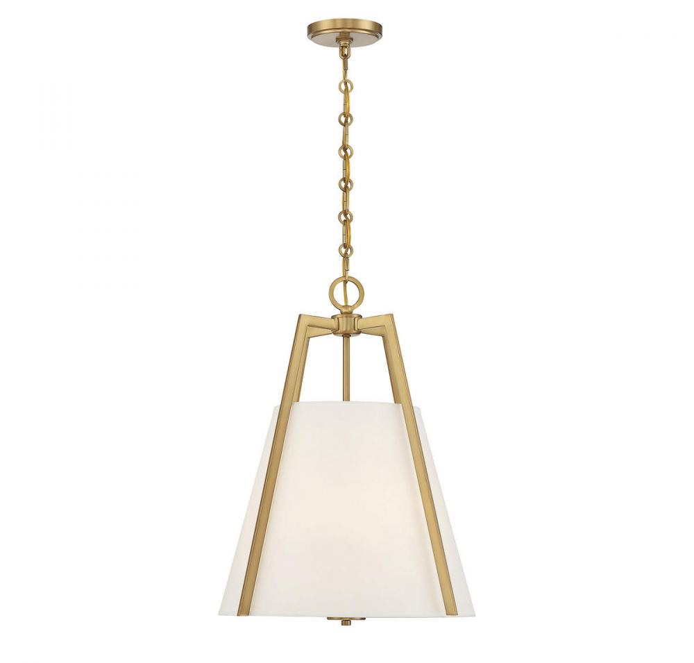 As crisp and thoughtfully tailored as a bespoke outfit, the Savoy House Mansfield 3-light pendant brings you fashionable lighting style. Features a white fabric shade held in place by jewelry-like prongs that are finished in warm brass. Mansfield is 21" in height and 18" in diameter. Uses three standard size bulbs of up to 60 watts per bulb. Comes with 120" of chain and 144" of cord.