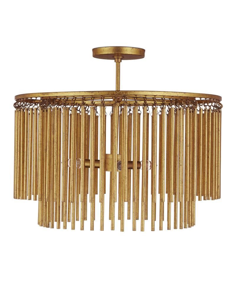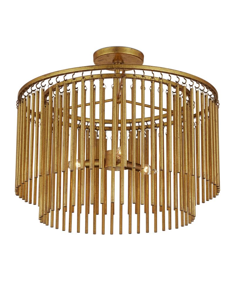 The Mantra Semi-Flush Mount is an elegant example of mid-century modern luxe. The gold leaf finish on the long tentacles of metal that dangle from its two tiers bring the fixture a powerful punch of patina. This is due to the distressing the finish artisans achieved with the gold leaf treatment on the chandelier. A shrewd design detail is how the rods of metal are affixed with small hooks, each of which has to be hand-welded to the circular frames of the gold semi-flush.