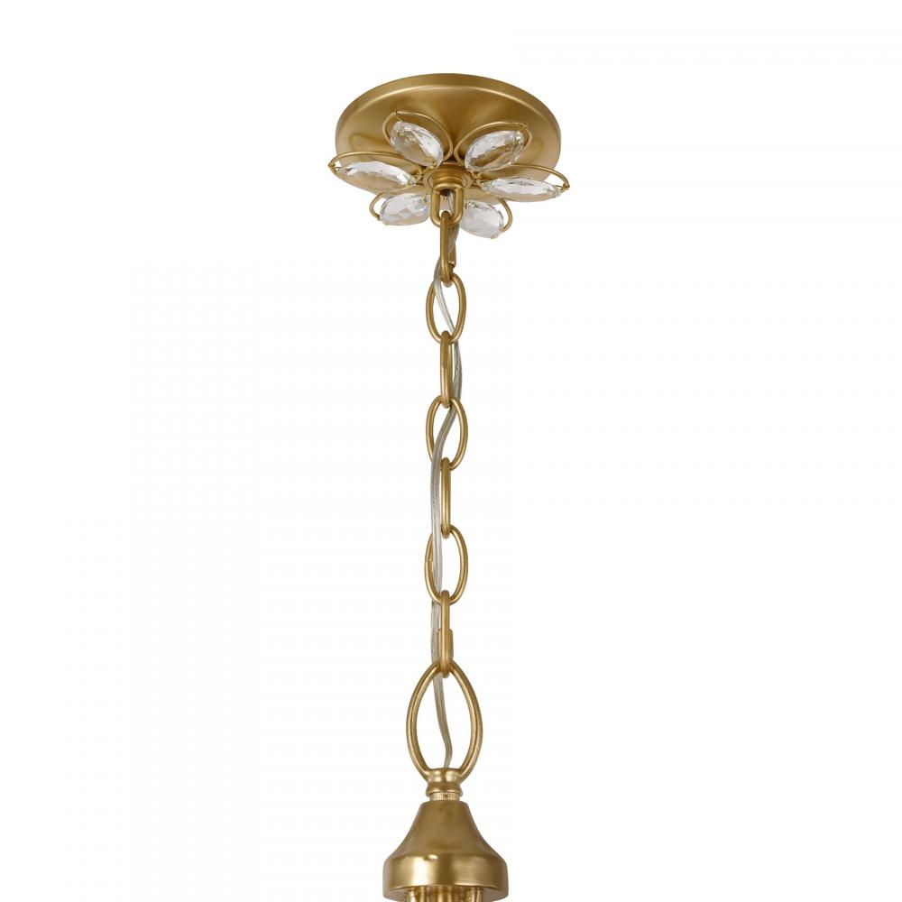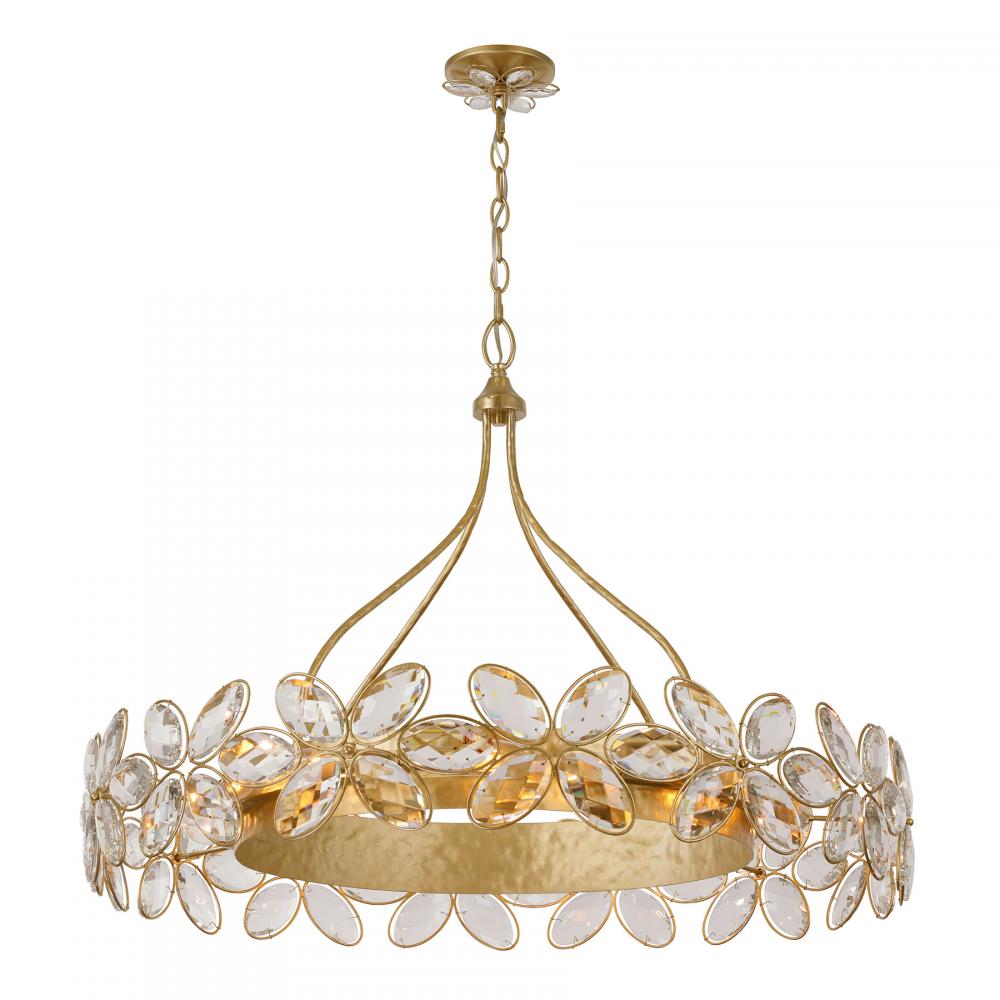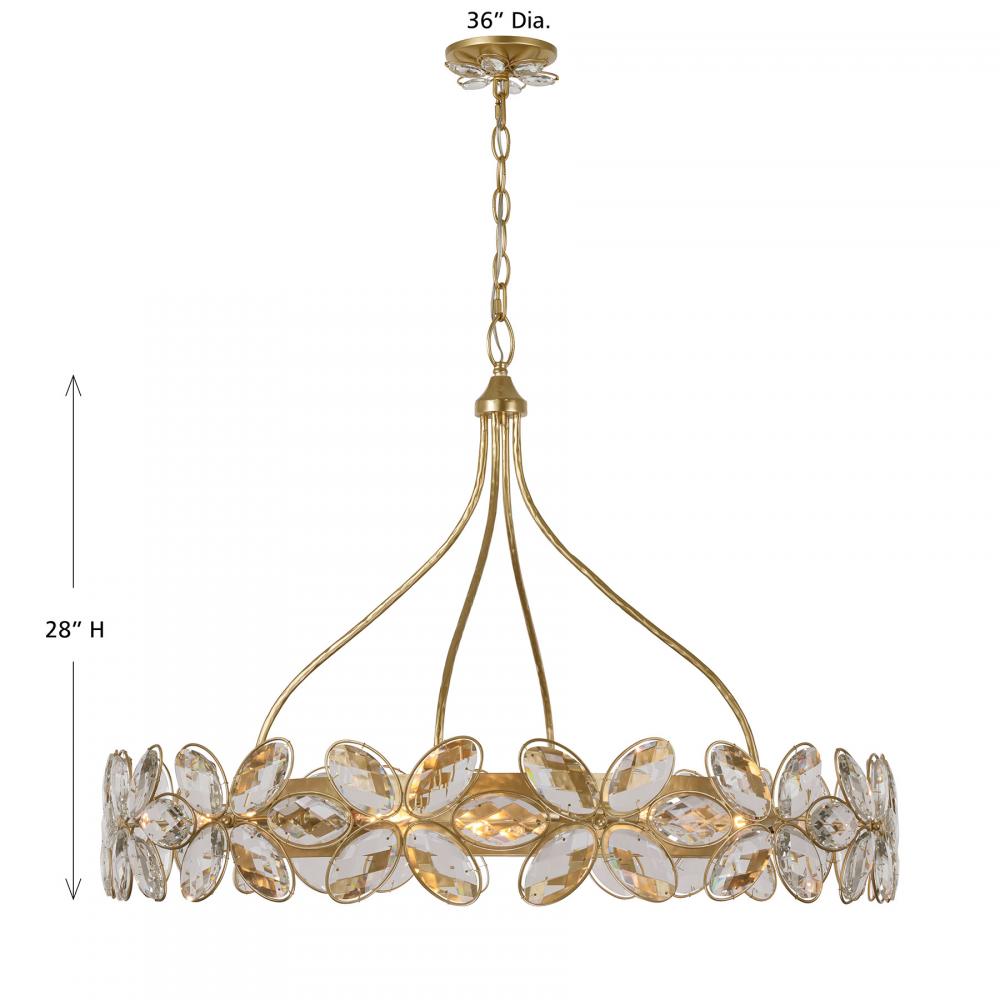 The Savoy House Marbella 14-light chandelier was designed by Breegan Jane, an award-winning interior designer and TV host. Breegan loves to travel to Spain and, accordingly, Marbella is named after a seaside Spanish city that boasts a significant archaeological heritage and pleasant coastal climate! Marbella has an elegant design that recalls fashionable bangle bracelets, its hammered metal adorned with flowers crafted from faceted K9 crystal. Another crystal flower also blossoms from the ceiling canopy! The hand-applied Gold Shimmer finish simply accentuates the beauty. Marbella is 28" in height and 36" in width. It uses fourteen candelabra size bulbs of up to 60 watts per bulb. Bulbs not included. Comes with 120" of chain.