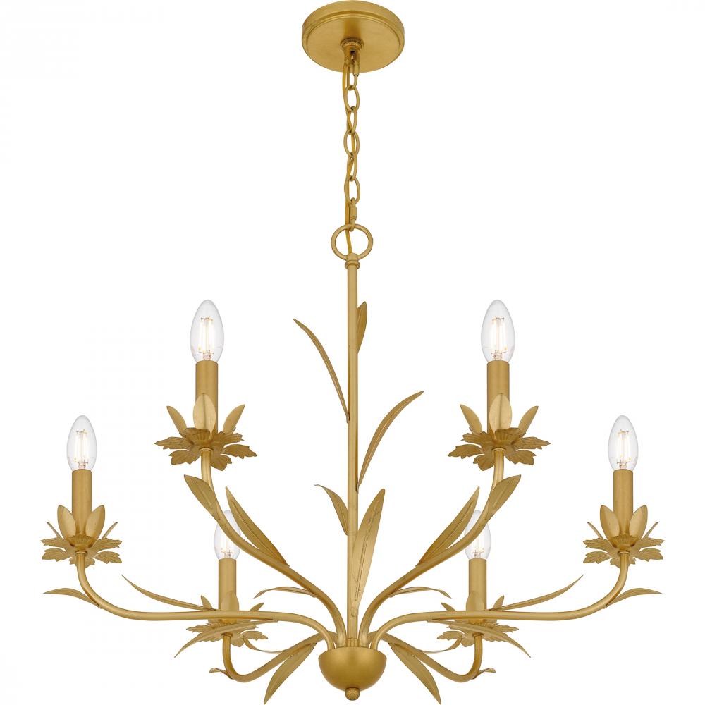 With a gold leaf finish and elegant design, Maria is as luxurious as it is modern. The pretty silhouette features softly curving lines and a subtle leaf motif, adding just the right amount of embellishment. Choose the six-light chandelier, perfect over a k