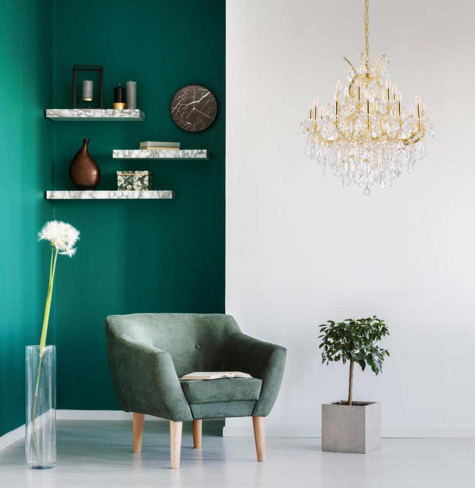 A heavenly high point to your home, Maria Theresa collection pendant lamps are ablaze with hundreds of resplendent crystals. Copious strands of sparkling clear or golden-teak crystals dangle from elaborate tiers of glass-coated steel arms in your choice of a chrome, gold, golden-teak, white, or black finish. An imperial favorite for the stairwell, dining room, or living room.