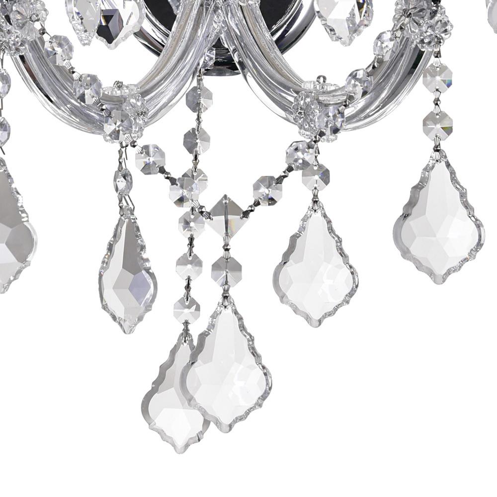 A candle-style wall sconce ready to bring a warm glow to your living room, dining room, hallway, or bedroom. The Maria Theresa 3 Light Wall Sconce features a chrome plate with chrome-finished candelabra arms adorned with dangling and draping clear crystals