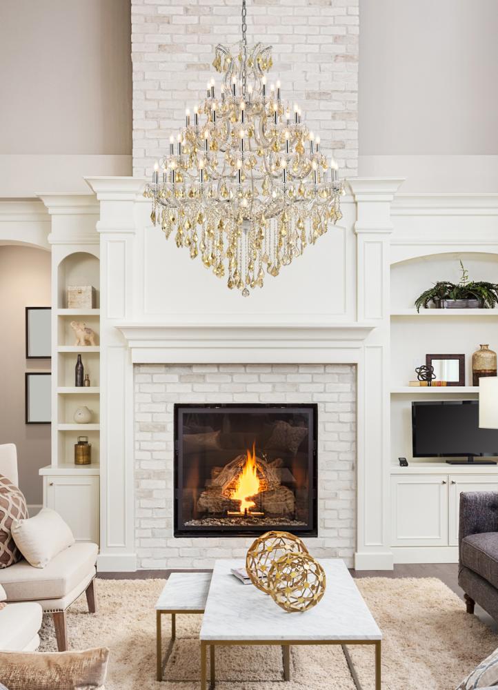 A heavenly high point to your home, Maria Theresa collection pendant lamps are ablaze with hundreds of resplendent crystals. Copious strands of sparkling clear or golden-teak crystals dangle from elaborate tiers of glass-coated steel arms in your choice of a chrome, gold, golden-teak, white, or black finish. An imperial favorite for the stairwell, dining room, or living room.