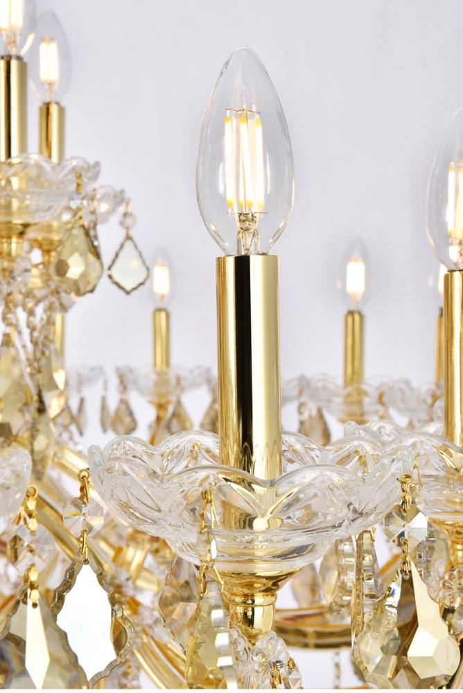 A heavenly high point to your home, Maria Theresa collection pendant lamps are ablaze with hundreds of resplendent crystals. Copious strands of sparkling clear or golden-teak crystals dangle from elaborate tiers of glass-coated steel arms in your choice of a chrome, gold, golden-teak, white, or black finish. An imperial favorite for the stairwell, dining room, or living room.