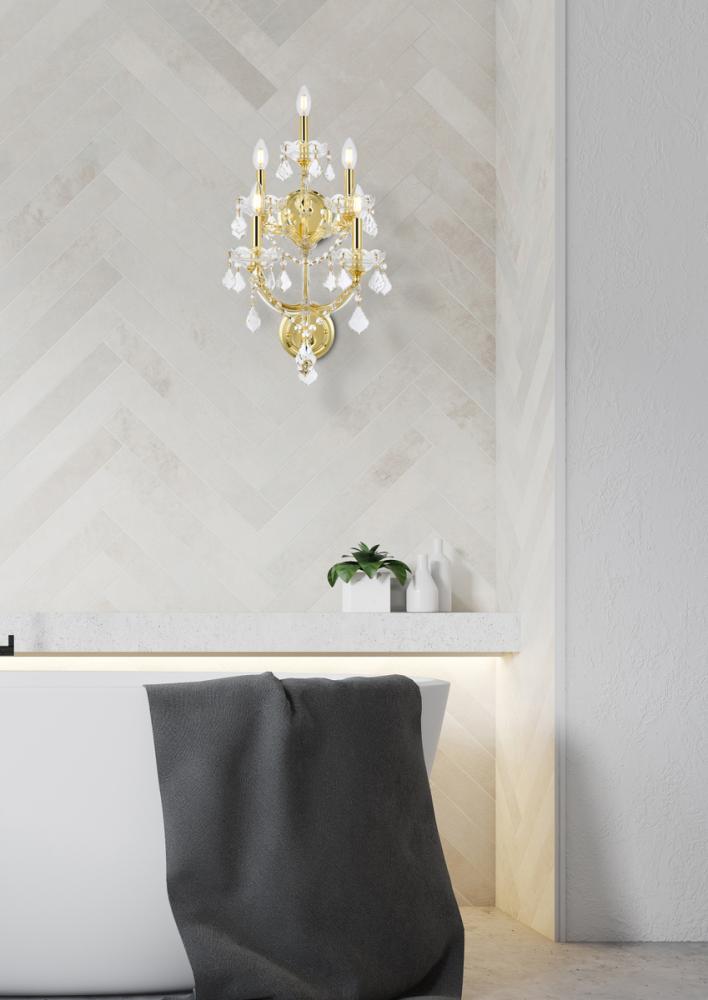 Give your foyer, hallway, or bathroom the royal treatment with the Maria Theresa collection wall sconces. Dazzling drop crystals in clear or golden teak shimmer amid glowing exposed bulbs. Gracefully arching glass-coated arms come in a range of finishes. A majestic display in a kaleidoscope of color combinations.