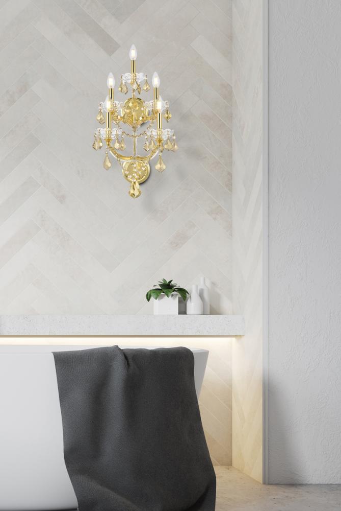 Give your foyer, hallway, or bathroom the royal treatment with the Maria Theresa collection wall sconces. Dazzling drop crystals in clear or golden teak shimmer amid glowing exposed bulbs. Gracefully arching glass-coated arms come in a range of finishes. A majestic display in a kaleidoscope of color combinations.