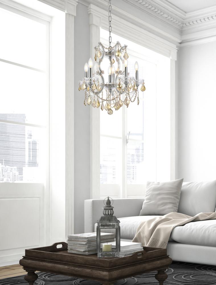 A heavenly high point to your home, Maria Theresa collection pendant lamps are ablaze with hundreds of resplendent crystals. Copious strands of sparkling clear or golden-teak crystals dangle from elaborate tiers of glass-coated steel arms in your choice of a chrome, gold, golden-teak, white, or black finish. An imperial favorite for the stairwell, dining room, or living room.