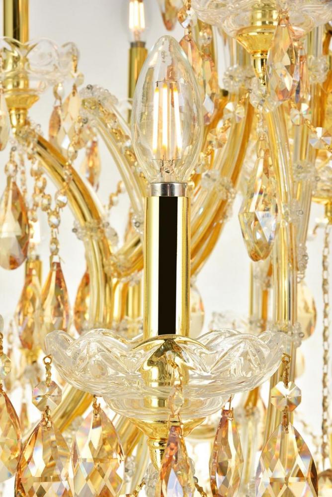 A heavenly high point to your home, Maria Theresa chandeliers are ablaze with hundreds of resplendent crystals. Copious strands of sparkling golden shadow crystals dangle from elaborate tiers of glass-coated steel arms in gold finish. An imperial favorite for the stairwell, dining room, or living room.