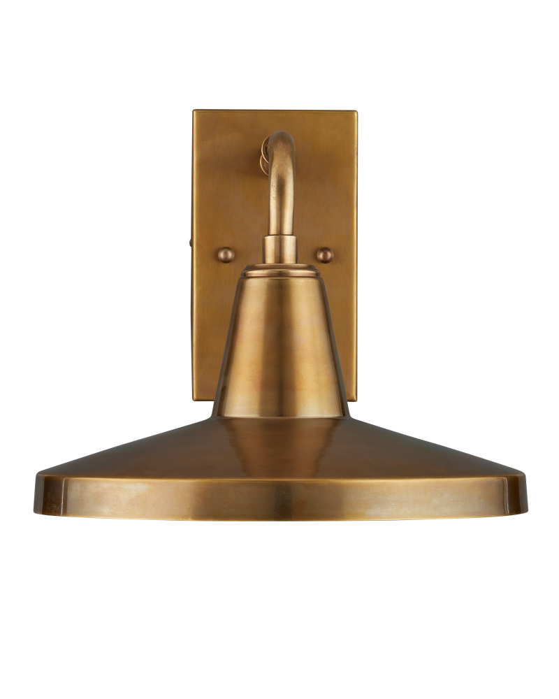 With its modern farmhouse feel, the Mariner Brass Outdoor Wall Sconce is made of brass in an antique brass finish. The warmth of the gold coloring with its textural patina, the shape of the geometric elements, and the simplicity of its form are the aspects that combine to make it a nostalgic design born during the early years of the Americana aesthetic.