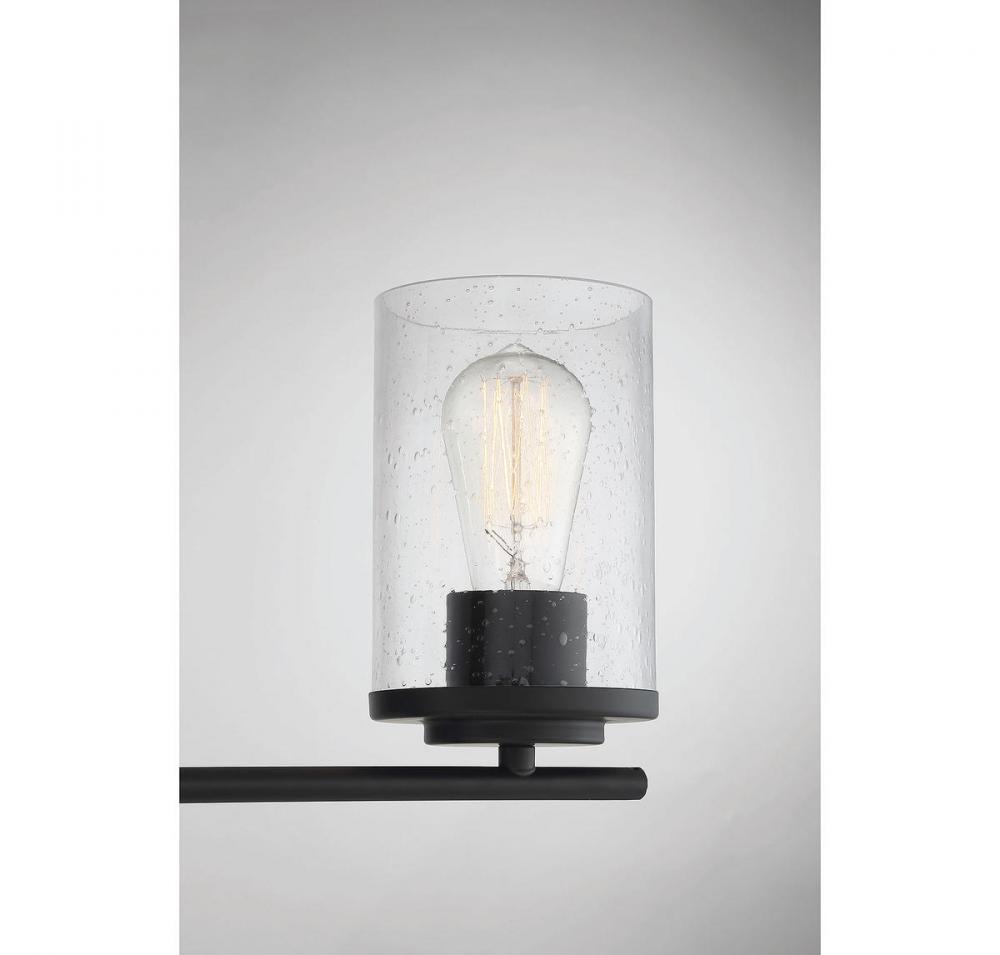 Illuminate your vanity mirror beautifully with this Savoy House Marshall 3-light bath bar. Its classic Americana look fits in perfectly with a wide variety of decor styles. The hurricane-style shades of clear seeded glass add a boost of drama and intrigue and the circular backplate brings in another dimension of thoughtful detailing. Finished in matte black. This fixture is 22" wide and 9.5" tall. It extends 6.5" from the wall. Uses 3 standard size bulbs of up to 60 watts each (not included).