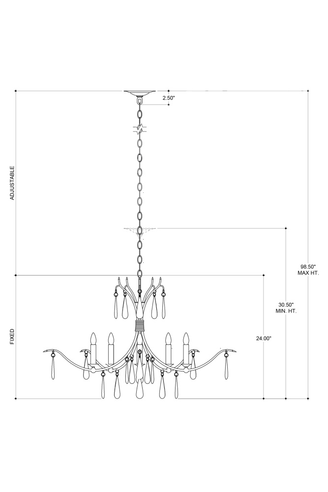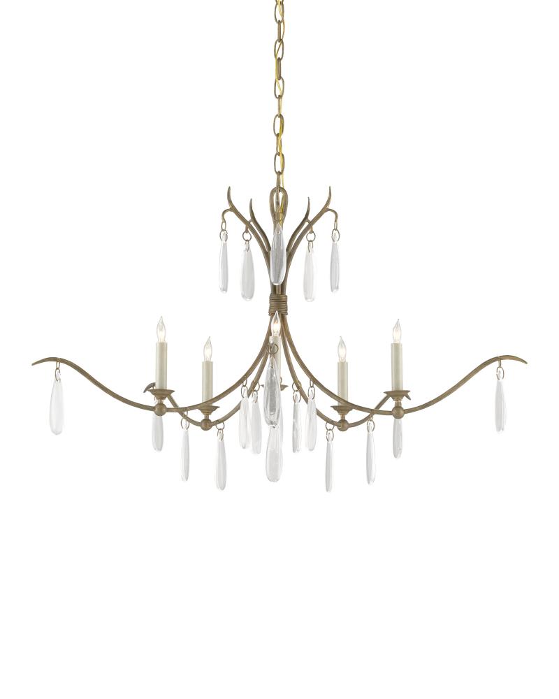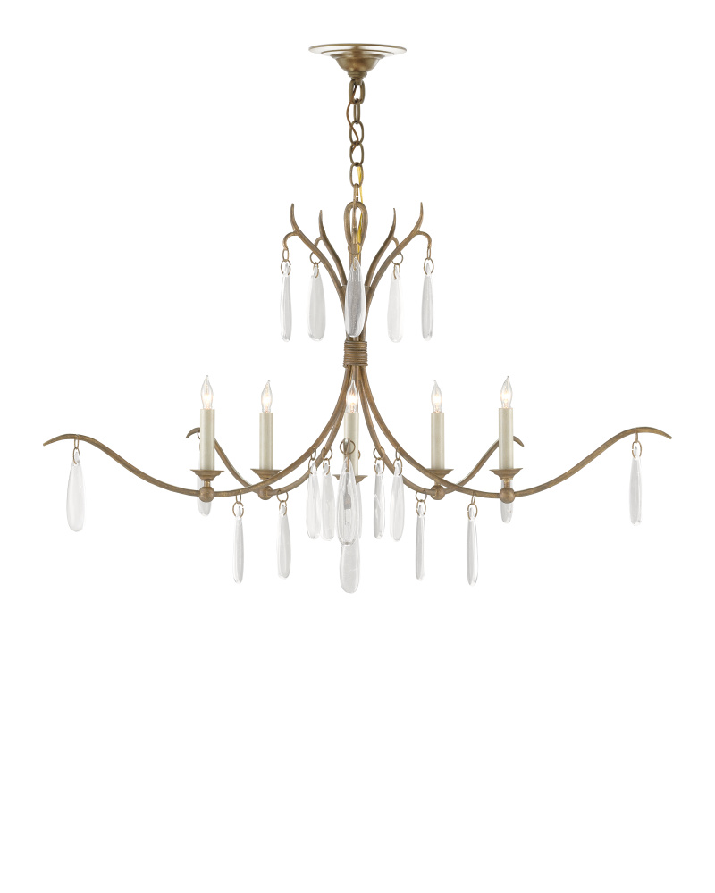 The Marshallia Small Chandelier, made of wrought iron in a rustic gold finish, has slender arms dripping with faux rock crystal pendants. A design detail of note is how the candle-sleeves for the five bulbs are unusually slender, which enhances the delicacy of this traditionally beautiful gold chandelier. Adjustable from 30.5" to 98.5" with use of included chain/rod kit/cable. If your space calls for a longer drop, additional chain/rods/cable is available for purchase.