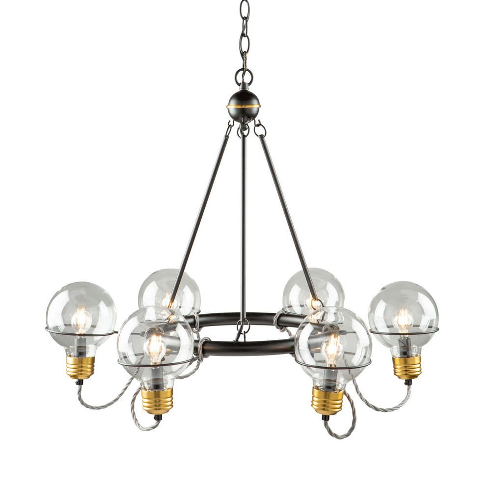 The "Martina Collection" is so unique from a design stance. The glass is actually shaped as a bulb and the bottom glass holder is designed like the bottom of a vintage screw type bulb. The wiring has a "vintage" element since it is twisted the way Thomas Edison first introduced the bulb. The metal work is black while the glass holder is brass. The small chandelier model is shown; there are many matching units available.