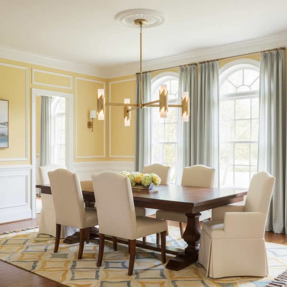 The Marvel 5 Light Chandelier is an adjustable height fixture finished in Aged Brass with each arm is accented by two pieces of Cased Opal Glass.