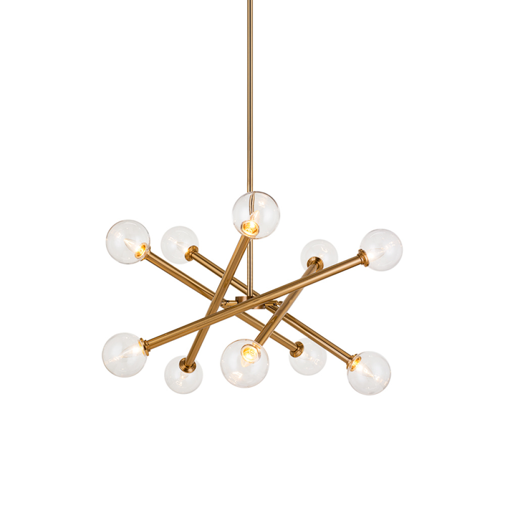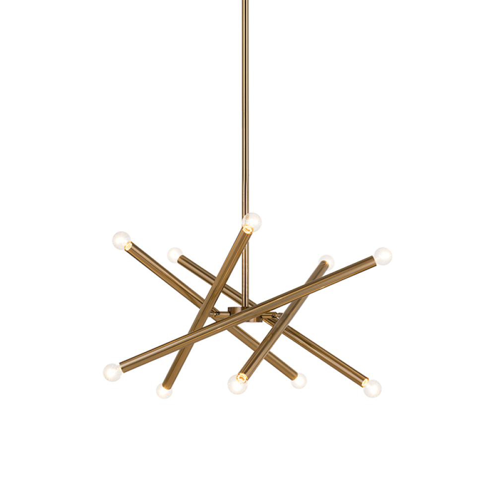 Matchstix chandelier will be a dramatic addition to any room. Modern movement in the crossing bar design will be a signature piece. Available in Aged Gold Brass or Black with either Clear or Opal glass.