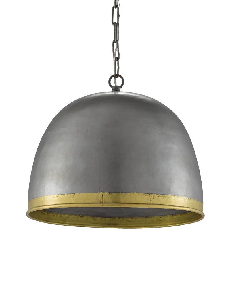 Leading the charge among our industrial chic offerings is our Matute Pendant, an edgy composition with a surprising mix of finishes. The dome-shaped shade is made of iron in a pewter finish. We dressed it up just a bit by adding a ring in a brass finish around the bottom edge. The interior of the shade has been treated to a polished brass finish to bring warmth to the illumination wafting from within the bold fixture.