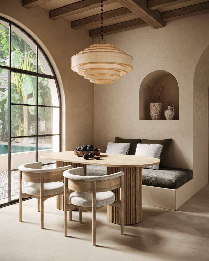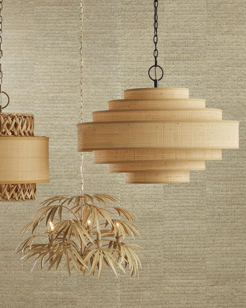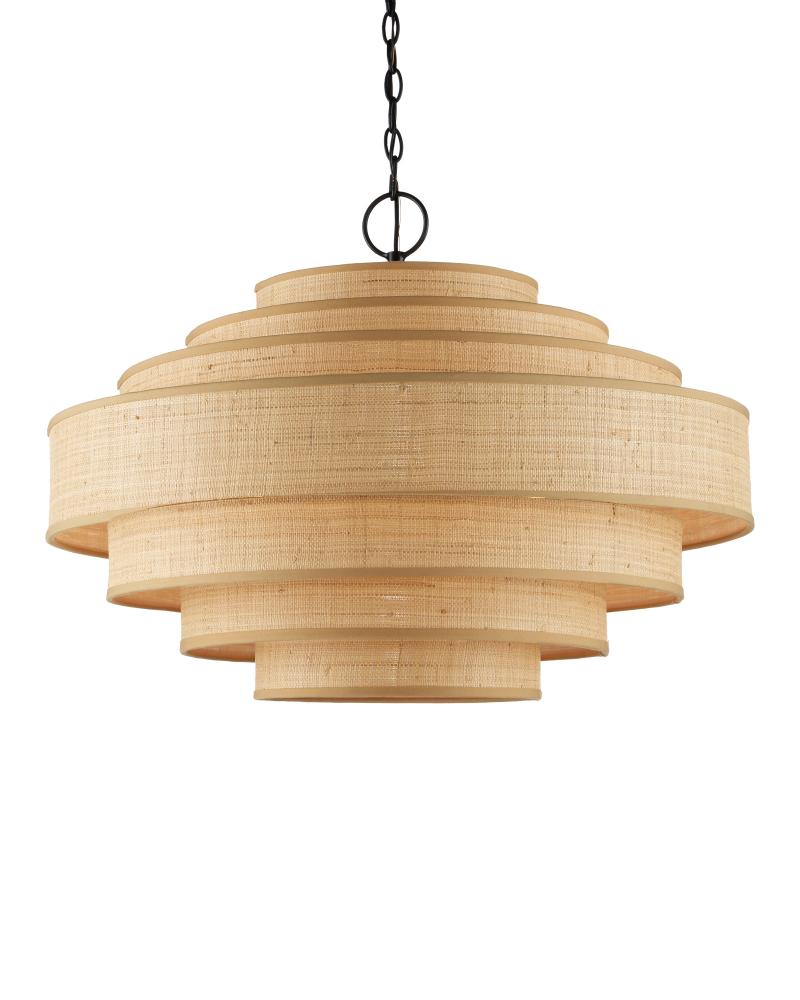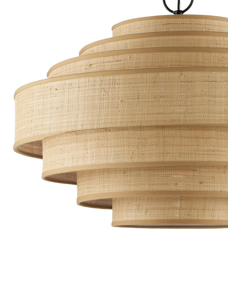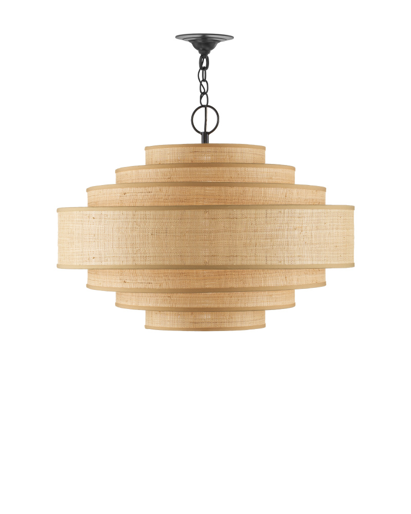 The grasscloth cylinders that make up the Maura Natural Pendant bring an elevated design statement to the fabric shades on this tan pendant. The metal frame in a satin black finish is a contrasting element to the natural grasscloth shades, which are trimmed for a more sophisticated profile. Though on the surface this design is seriously simple; it is far from it, as the uniformity of the layered shades seen when looking up into the fixture is a precise effort that takes great skill. Adjustable from 27" to 96" with use of included chain/rod kit/cable. If your space calls for a longer drop, additional chain/rods/cable is available for purchase.