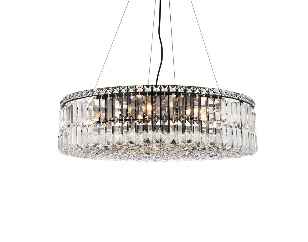 A riot of shapes and textures, Maxime collection hanging fixtures sparkle in a mosaic of crystal tiles. Square and rectangular precision-cut crystals form the flamboyant exterior while faceted crystal balls create a bubbled effect for light to shine through beneath. A mischievous asymmetrical hanging tube adds a touch of whimsy to this structured design. Available in a black or chrome finish with clear crystals, these lamps are a luxurious addition to a dining room, stairwell, foyer, or living room.