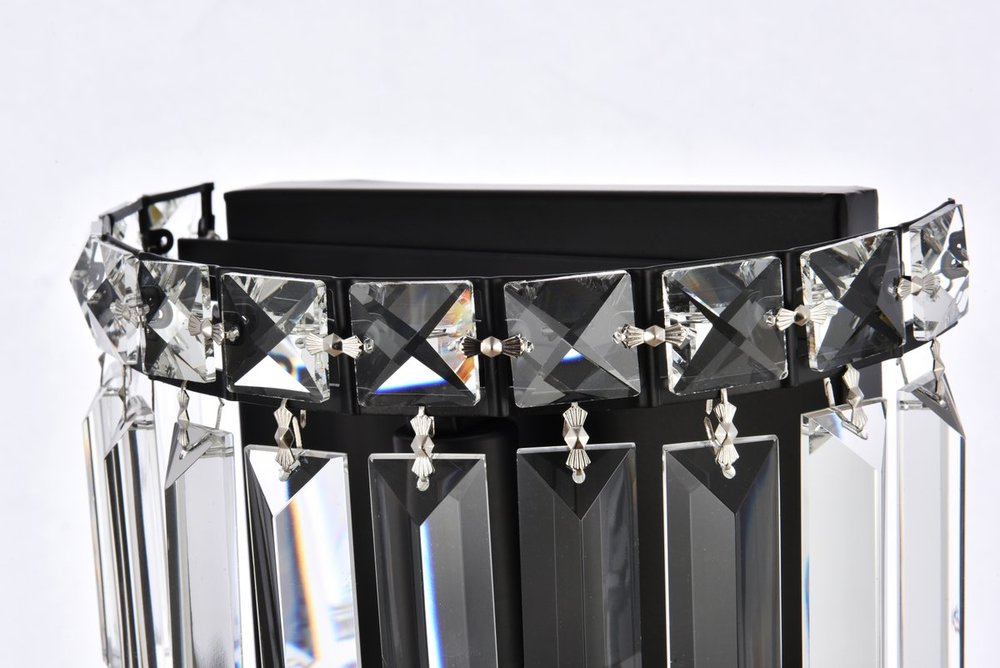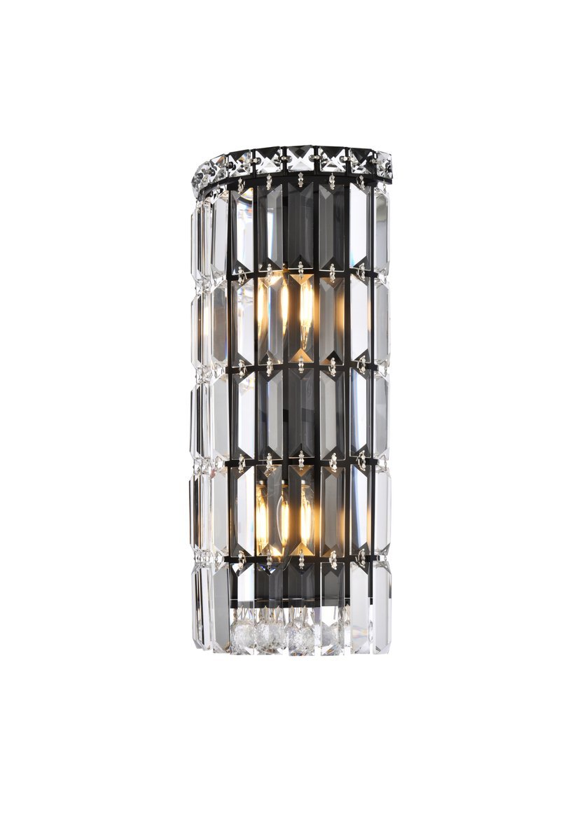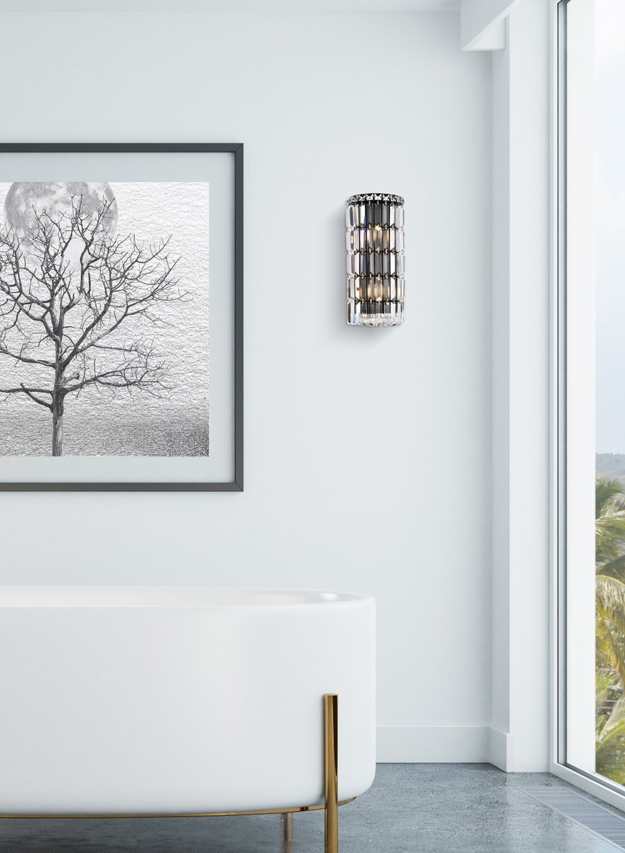 A riot of shapes and textures, Maxime collection wall sconces sparkle in a mosaic of crystal tiles. Square and rectangular precision-cut crystals form the flamboyant semicylindrical or rectangular exterior while faceted crystal balls create a bubbled effect for light to shine through beneath. Available in a black or chrome finish with clear crystals, these lamps are a luxurious addition to a bathroom, entryway, or kitchen.