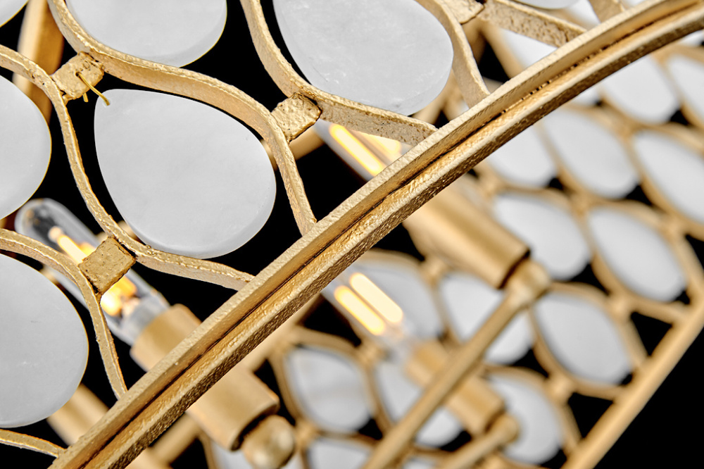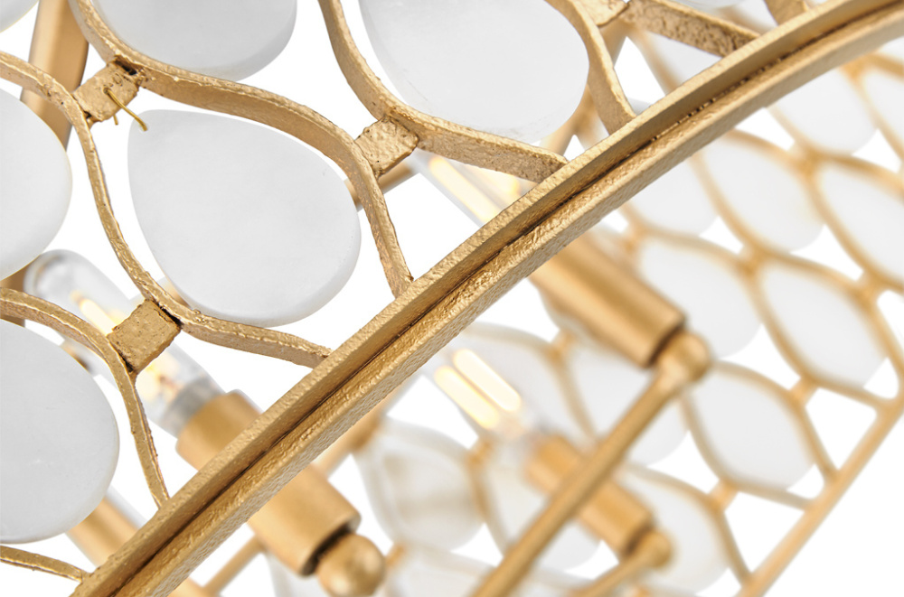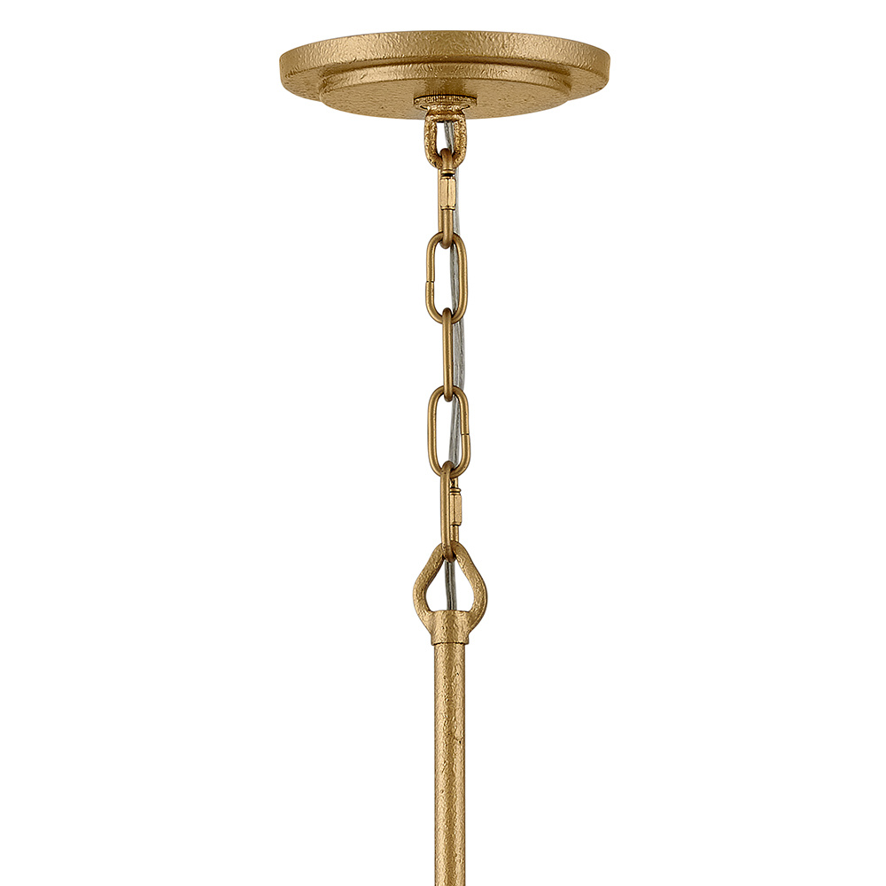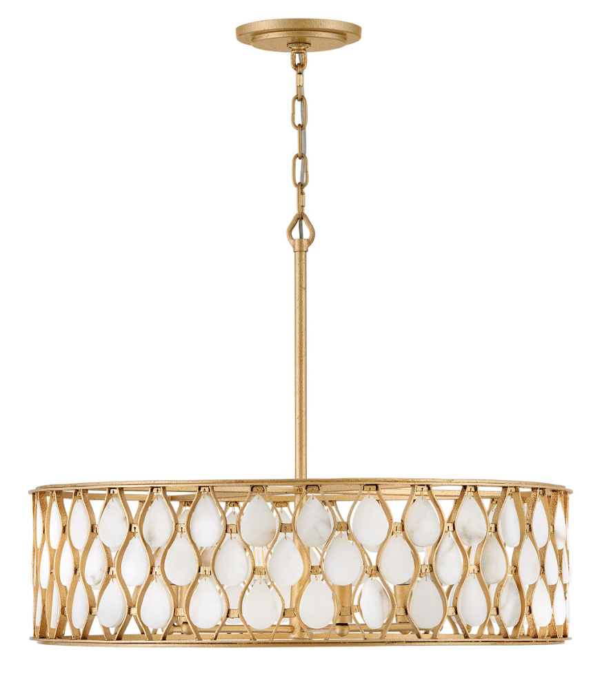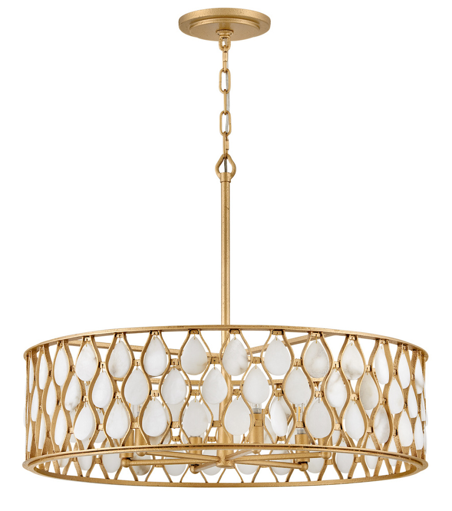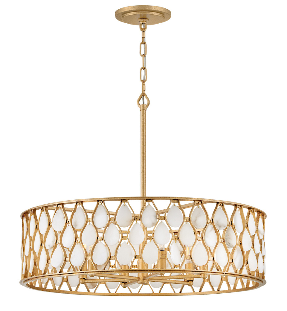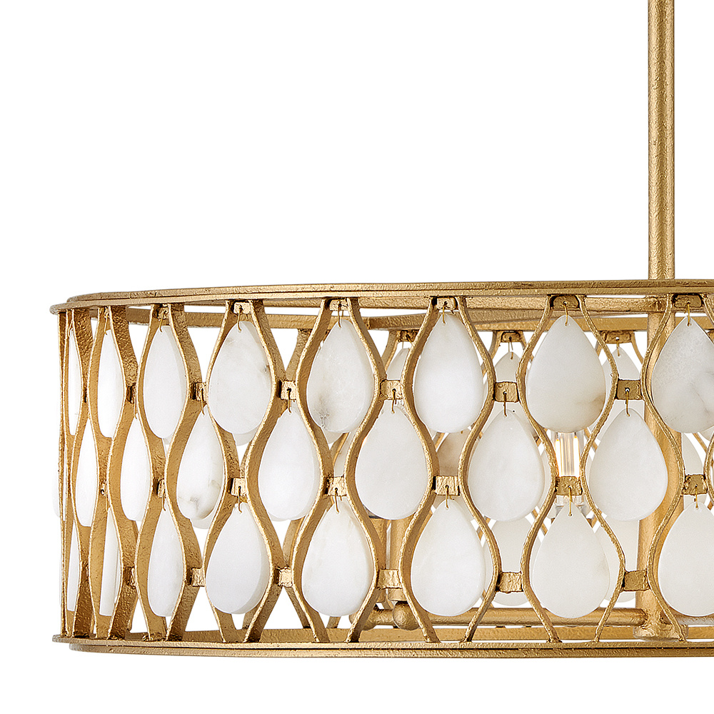 Opulently adorned with natural alabaster stones held within a traditional latticework shade, Estie brings organic elegance to any aesthetic. Intricately curved metalwork complements the frame, chain, and canopy in a textured Piastra Gold finish.