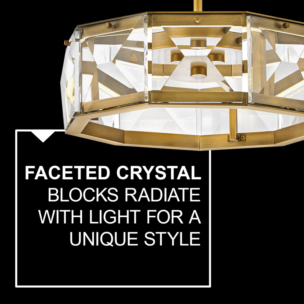 Jolie is a unique blend of sophistication, style, and technology. Integrated LEDs are sleekly concealed within gleaming Heritage Brass rings at the top and bottom of the design. Robust blocks of faceted crystal radiate with light, creating a transfixing silhouette while providing outstanding illumination.