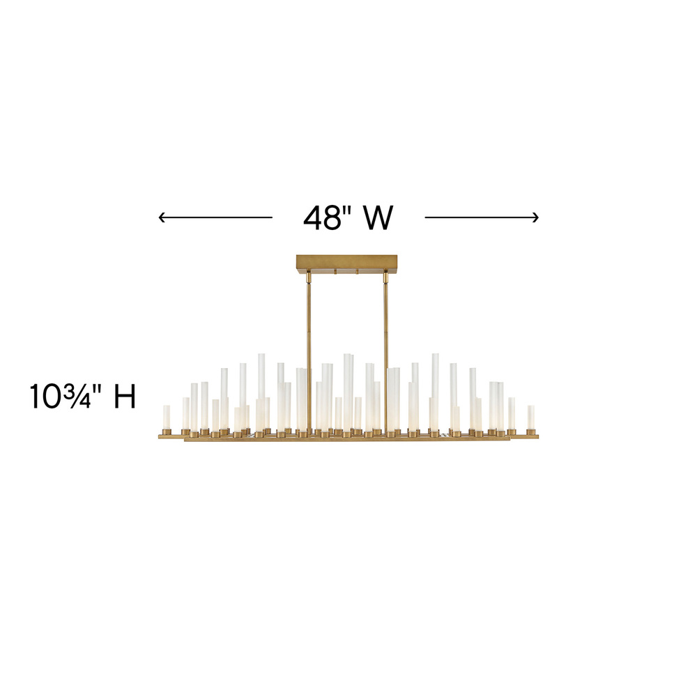 This stunning silhouette suggests rows of candles burning at different rates as in days of old, yet Trinity is modern in every aspect. Each frosted glass column is evenly lit with integrated LED, producing multiple points of light in undulating fashion along the Polished Nickel or Heritage Brass frame. The effect is breathtaking, unexpected and completely spectacular.