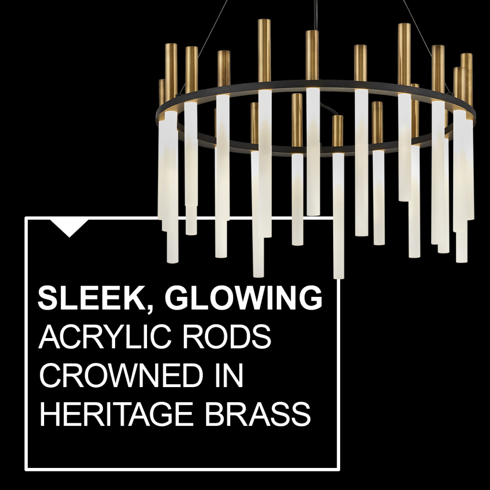 Echo’s spectacular, integrated LED design reverberates with modern style. Sleek, glowing acrylic rods are crowned in metal tubes giving a contemporary look. Echo is offered in Heritage Brass finish accented by bold Black.