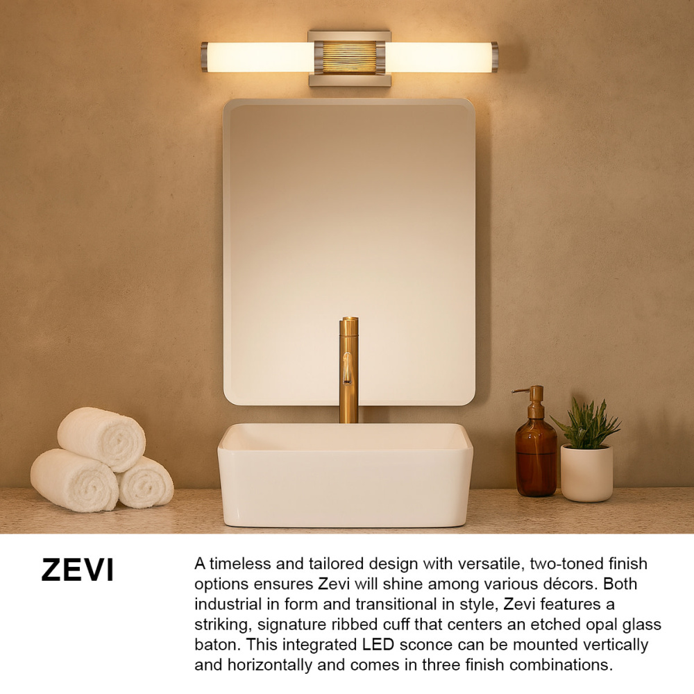 A timeless and tailored design with versatile, two-toned finish options ensures Zevi will shine among various décors. Both industrial in form and transitional in style, Zevi features a striking, signature ribbed cuff that centers an etched opal glass baton. This integrated LED sconce can be mounted vertically and horizontally and comes in three finish combinations.