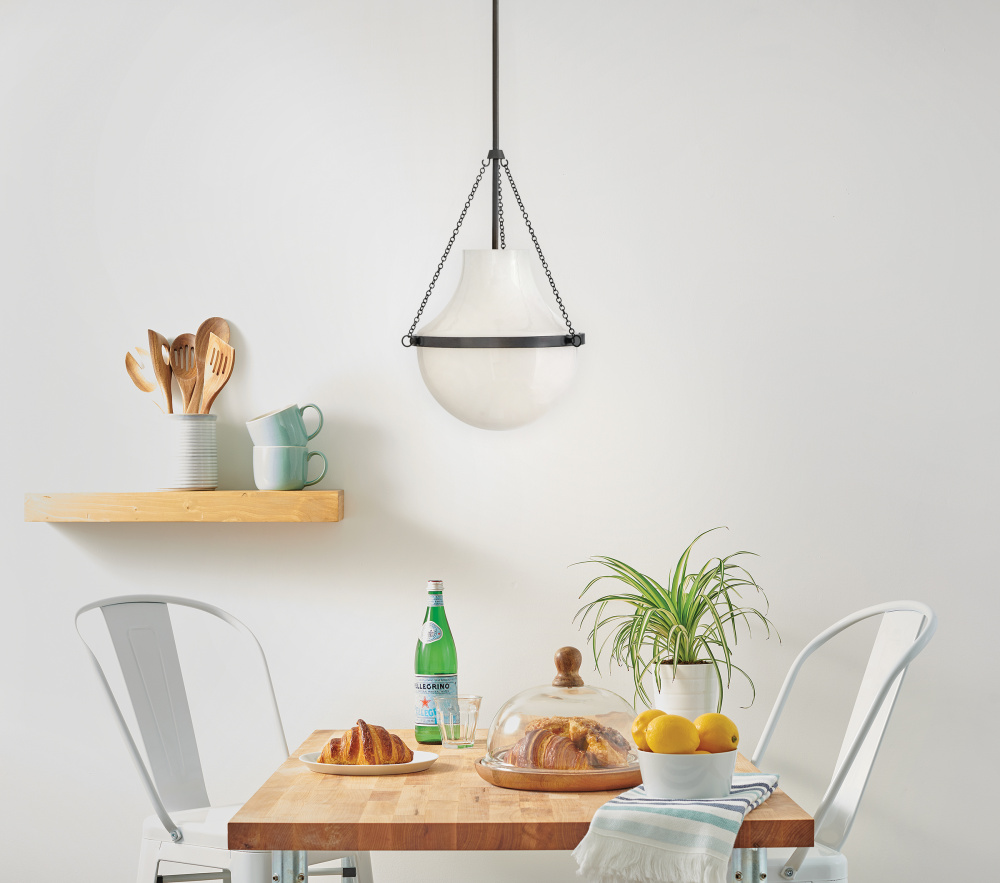 Fusing a sculpted, modern form with classically styled details, Collins features a transitional teardrop shade crafted from blown, cased opal glass. A central metal band and delicate chain uprights are available in Heritage Brass or Black Oxide finishes.