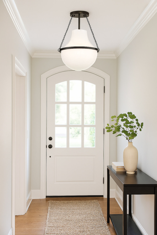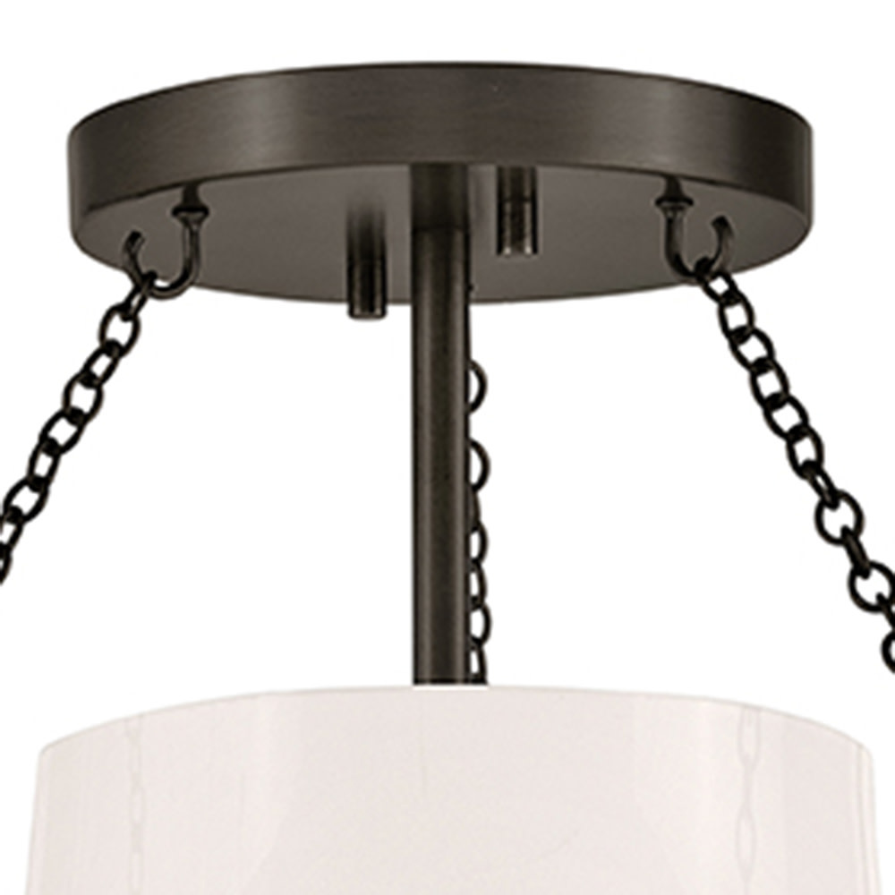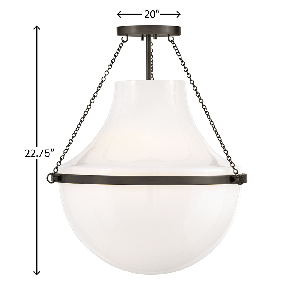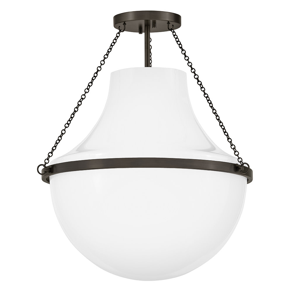Fusing a sculpted, modern form with classically styled details, Collins features a transitional teardrop shade crafted from blown, cased opal glass. A central metal band and delicate chain uprights are available in Heritage Brass or Black Oxide finishes.