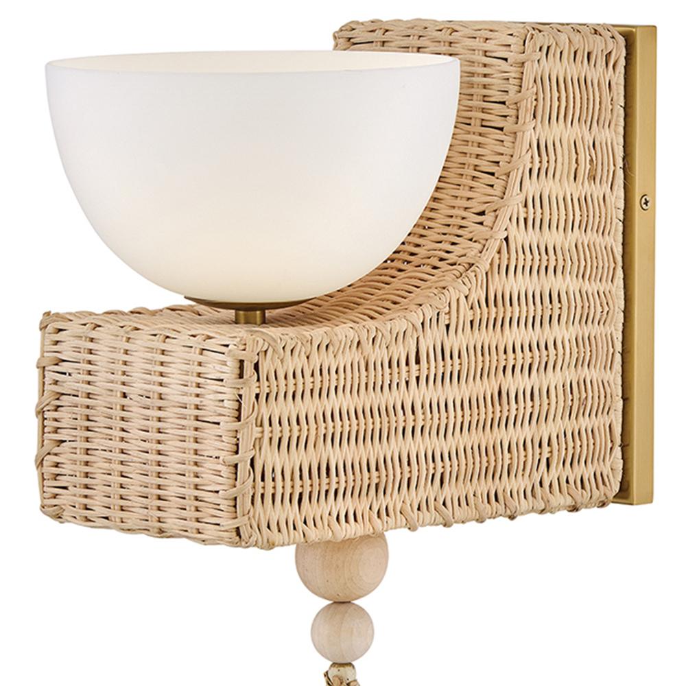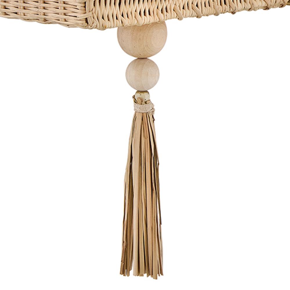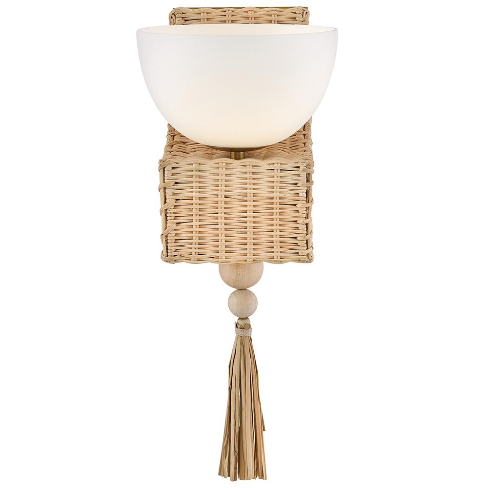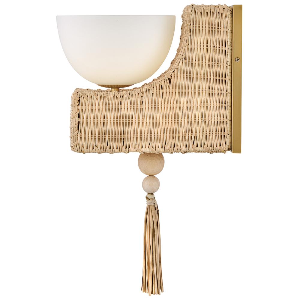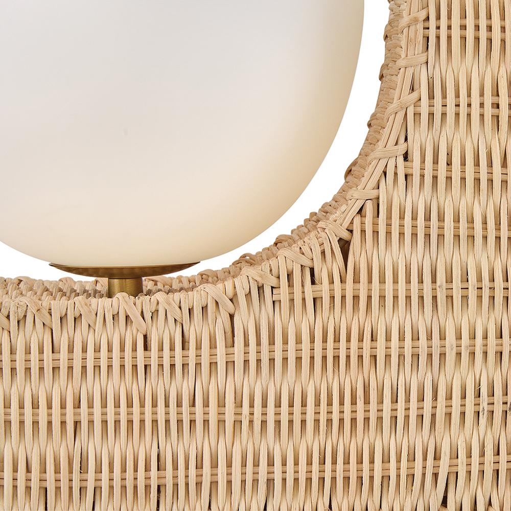 Named after a beach in Laguna, California, marked by a single, large palm leaf umbrella in the sand – Thalia’s distinctive, whimsical woven design evokes the relaxed, carefree spirit of coastal living. Natural raffia is complemented by a shallow opal glass bowl, and a playful tassel adds a fun bohemian touch that can be removed for a more streamlined look.