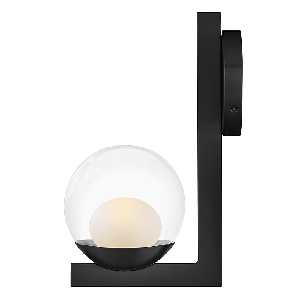 Sophisticated with an ultramodern twist, Sunni’s sleek design showcases a distinctive glass globe that artfully layers a clear glass outside with an etched white interior. A minimal backplate and frame are finished in a bold Black or luxurious Lacquered Brass finish to easily complement your space.