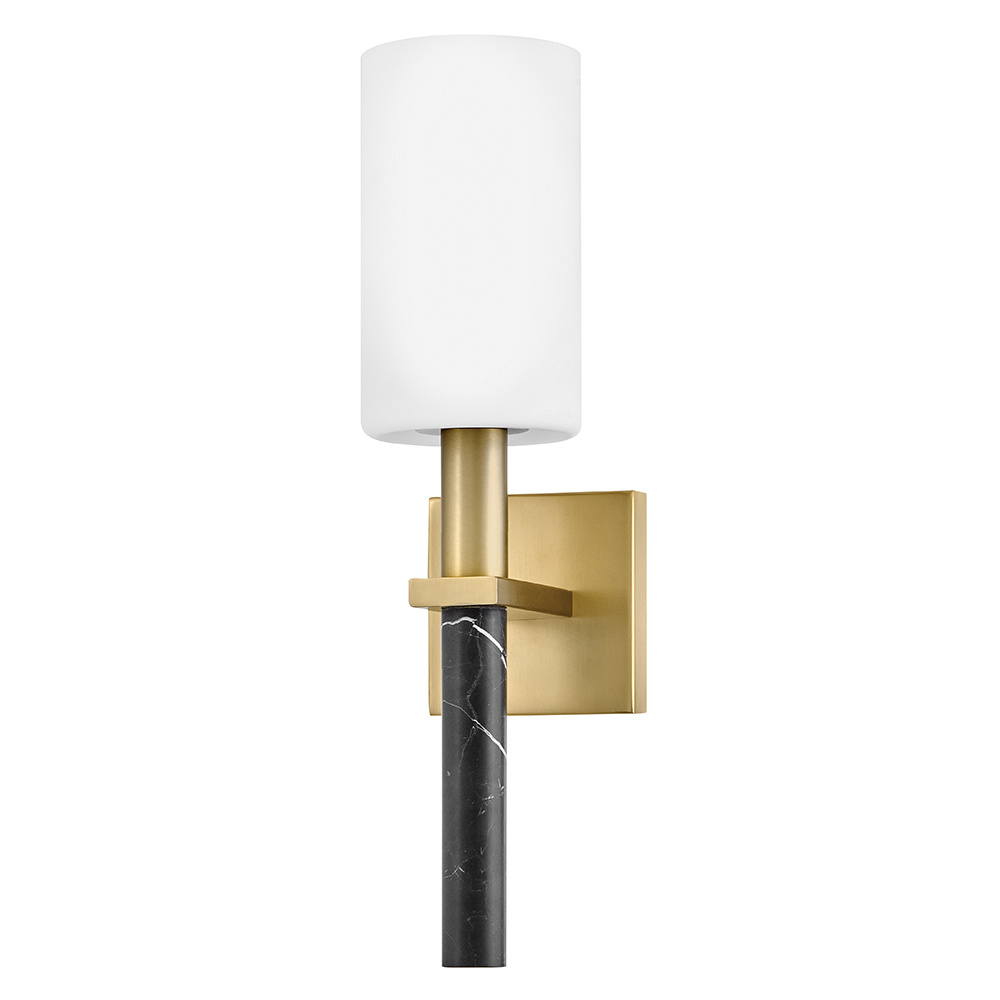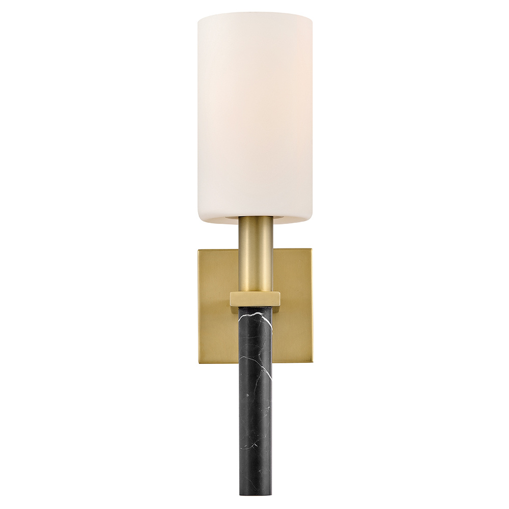 Polished with an understated silhouette, Turin is elevated by tall Etched Opal Glass and luxurious black marble stems. A minimalist backplate finished in vibrant Lacquered Brass complements the natural stone with an elegant touch of warm color.