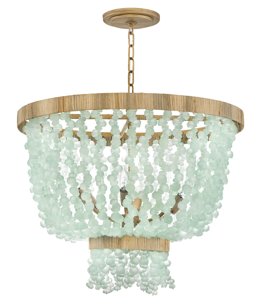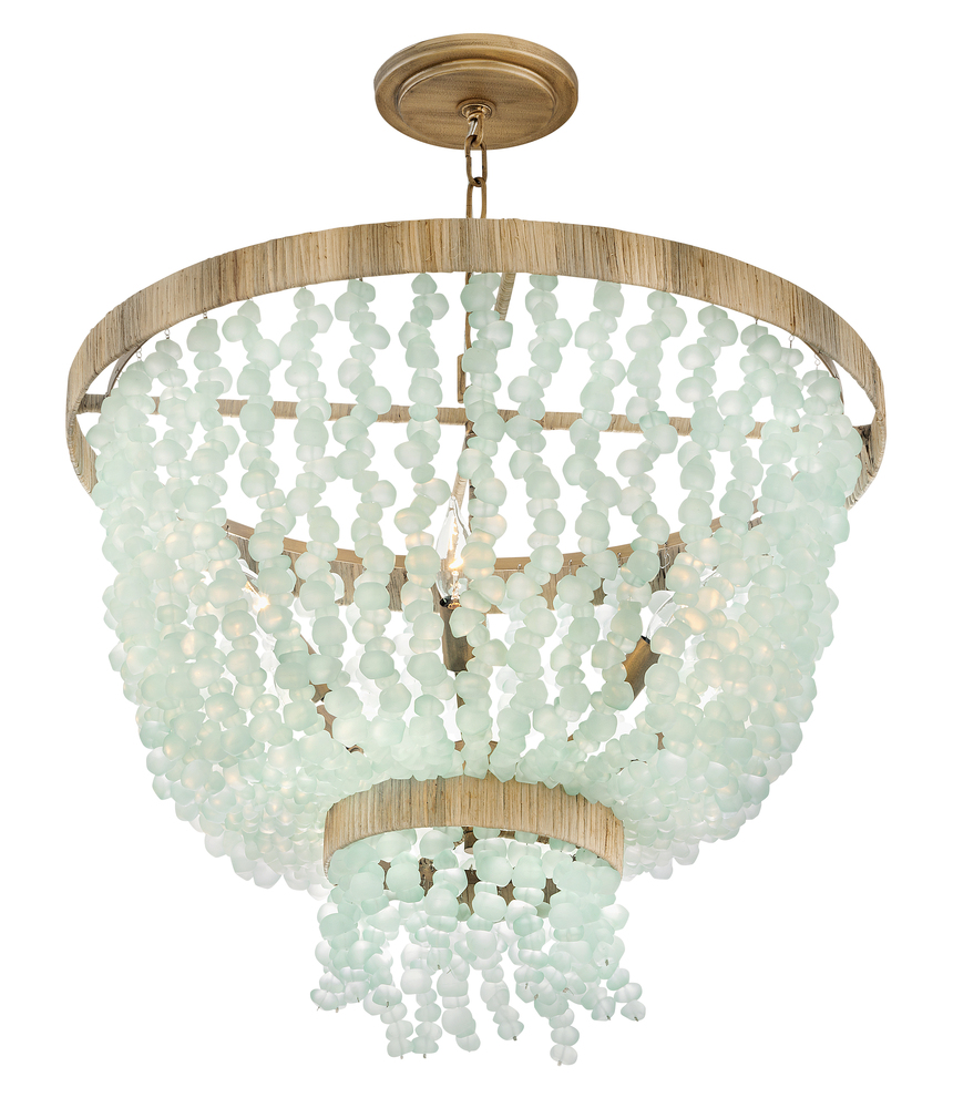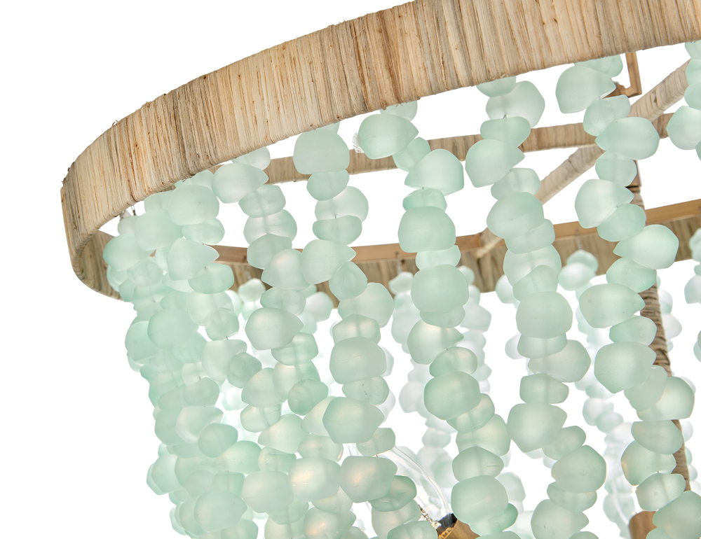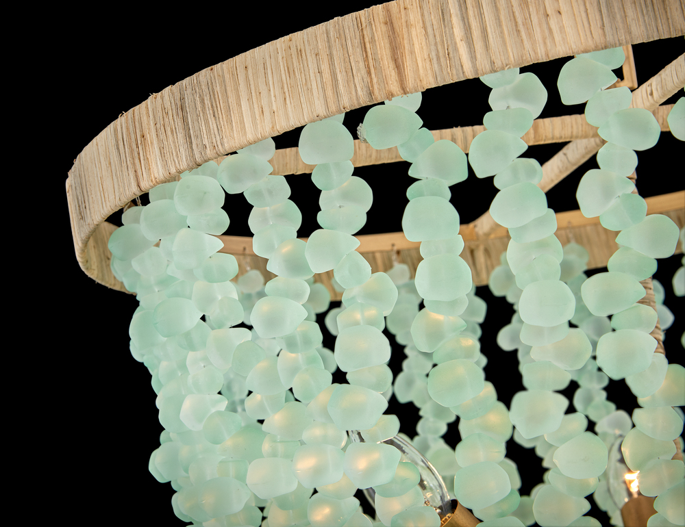 Dune's bohemian chic design showcases strands of soft sea glass combined with a Burnished Gold finish. The designs blend a sophisticated silhouette with organic elements inspired by sun and surf. Dune infuses any space with timeless, mesmerizing elegance.