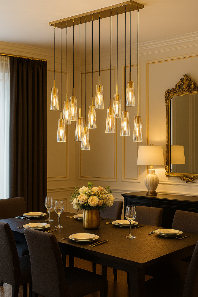 Dramatic and sleek, Cosette exudes opulent charm with an elongated silhouette and luxurious cut crystal. Two luxurious shade options, smokey gray or clear, beautifully cast a rich, multi-faceted light pattern. Adjustable cords designed for easy installation allow you to arrange your fixture to match your space and style.